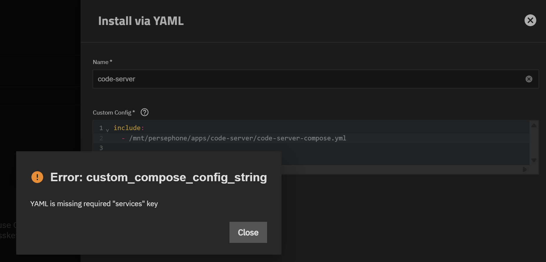 In all previous versions where we have had the ability to input custom apps via YAML this has worked to simply pull the compose.yml from a single directory with all of my compose files and create/start the container. Now on 25.10 RC1 it is giving me the error I mentioned above.