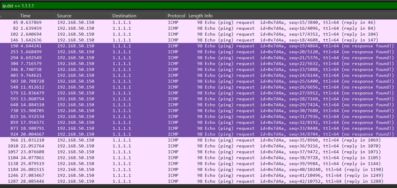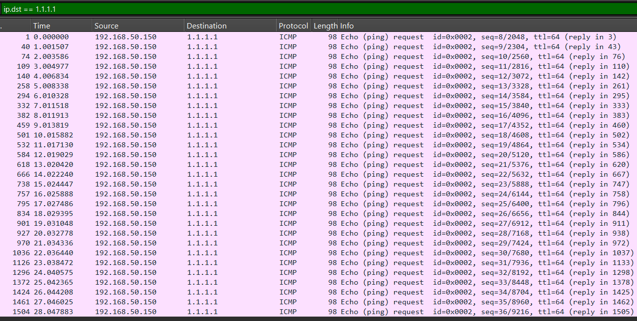 While the capture was running, I ran a ping to 1.1.1.1 (Cloudflare) for the full 30 seconds.
