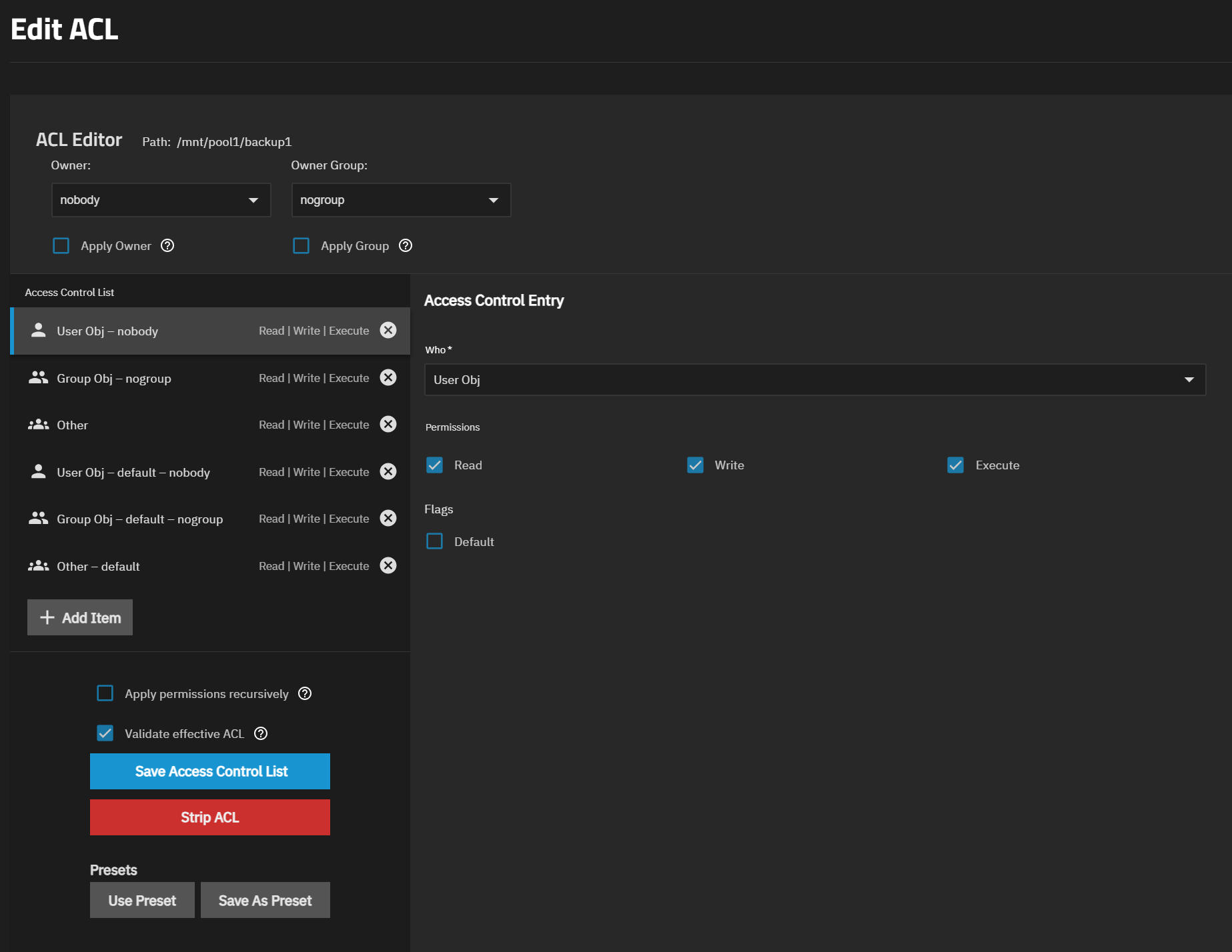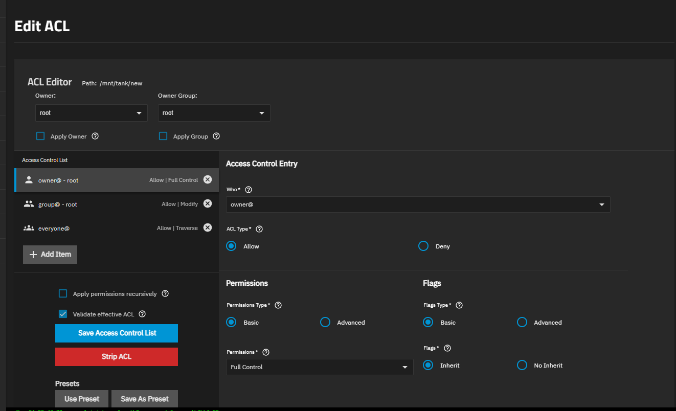 Regarding the screenshot you linked: The ACL editor depends on the ACL type that is configured in the dataset settings. The ACL editor for Posix ACL is different from the editor for NFSv4 ACL.