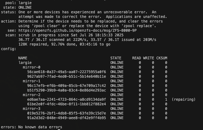Edit: I assume you’re mentioning my last screenshot where only 3 drives have checksum errors. Each scrub is wildly different - typically all drives report checksum errors.