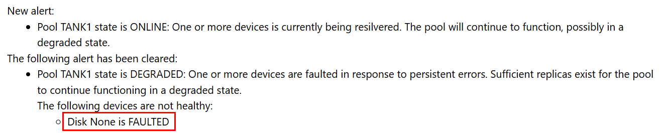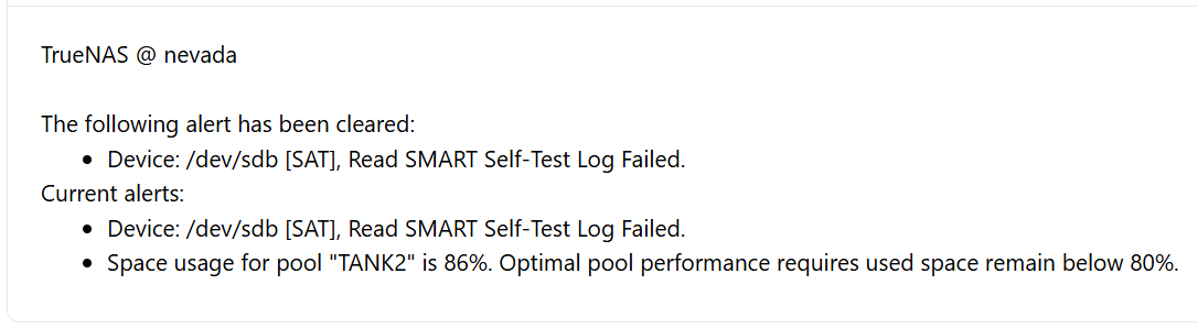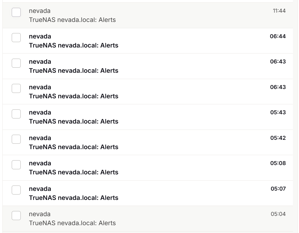 One of my boxes (TrueNAS-24.10.2.1) probably has a wonky cable or a broken drive (or two), but what surprised me is the way TrueNAS reports about this. For starters, this is my infra inbox for past few days: