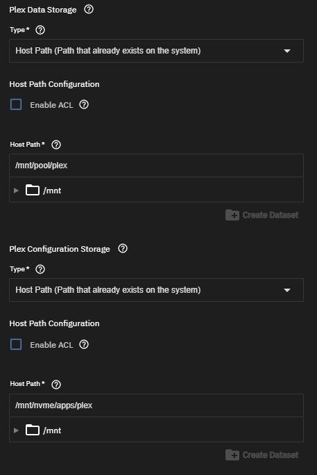 /mnt/pool/plex is on my slower HDDs and is where I have my media stored. /mnt/nvme/apps/plex is where I store my configuration and DBs on my faster NVMe mirror.