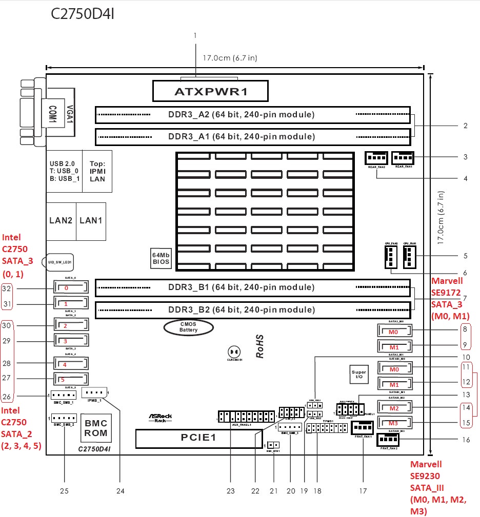 Below is an image of the motherboard which I’ve annotated with the four SATA controllers.