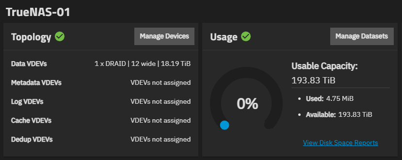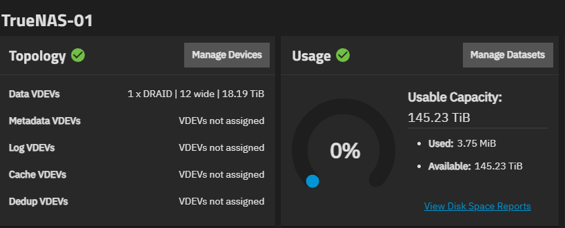 All good points. I think ultimately I’m going to be forced to go with RAIDZ because my system, either due to TrueNAS’s DRAID implementation, or in spite of it, erroneously loses too much usable space with DRAID. At $400/disk, TrueNAS’s DRAID is (inexplicably, especially at the “estimated” to “reality” stage) penalizing me about $800 here, not to mention the lost space and needing to buy more $400 disks, in the future, on account.