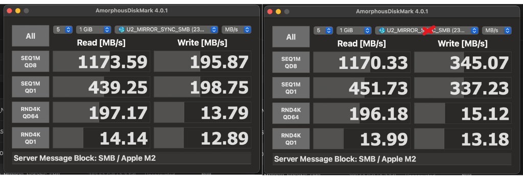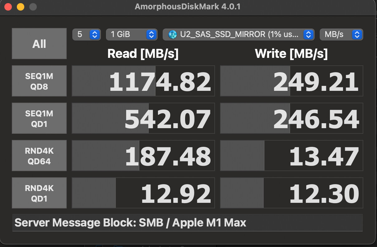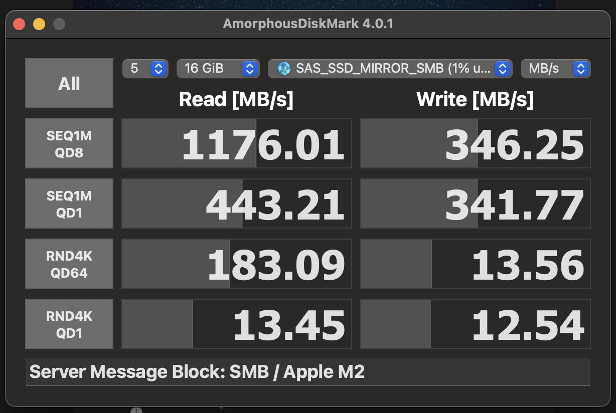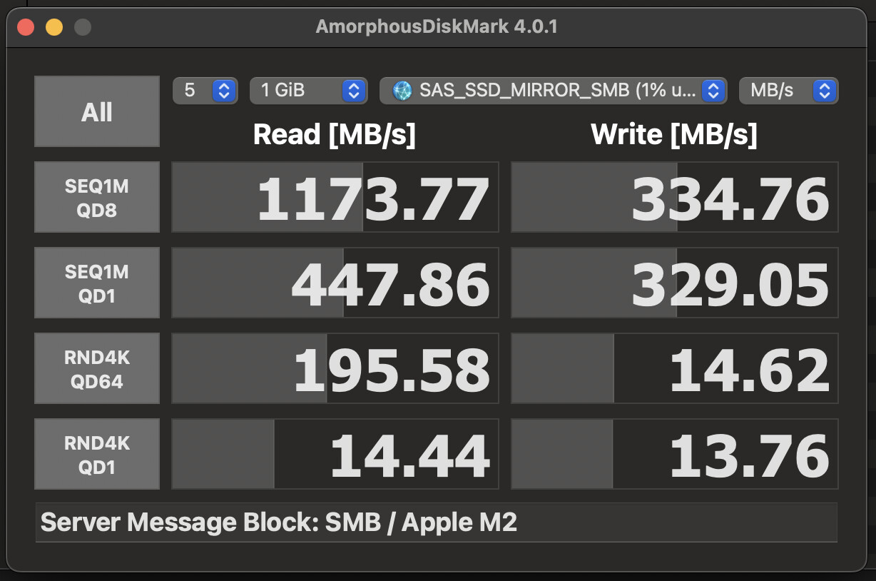 So by “mounting”, I’m thinking you mean how is the OS running the test connecting to the share and for that I’m just using the Mac OS Finder’s network built-in samba to the share on the network. Physically, my MacBook Air M2 is connecting over Thunderbolt (3) to an ATTO Thunderlink SFP+ dock, fiber to a cheap switch, DAC to the Intel NIC in my TrueNAS. I haven’t gotten to link aggregation to try for a 10 + 10 GbE setup yet. I suspect there are other improvements possible here.