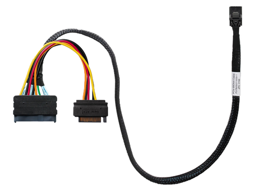 You use a SFF-8643 to SFF-8639 cable, which comes with its power connector for the drive: