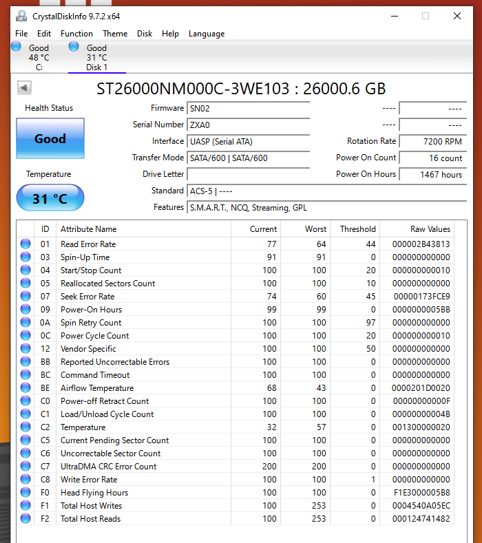 On Windows running CrystalDiskInfo says it’s “Healthy”. However, I also tried smartctl via the Windows command line, but I get an error “failed: input/output error” when trying short or long S.M.A.R.T. tests.