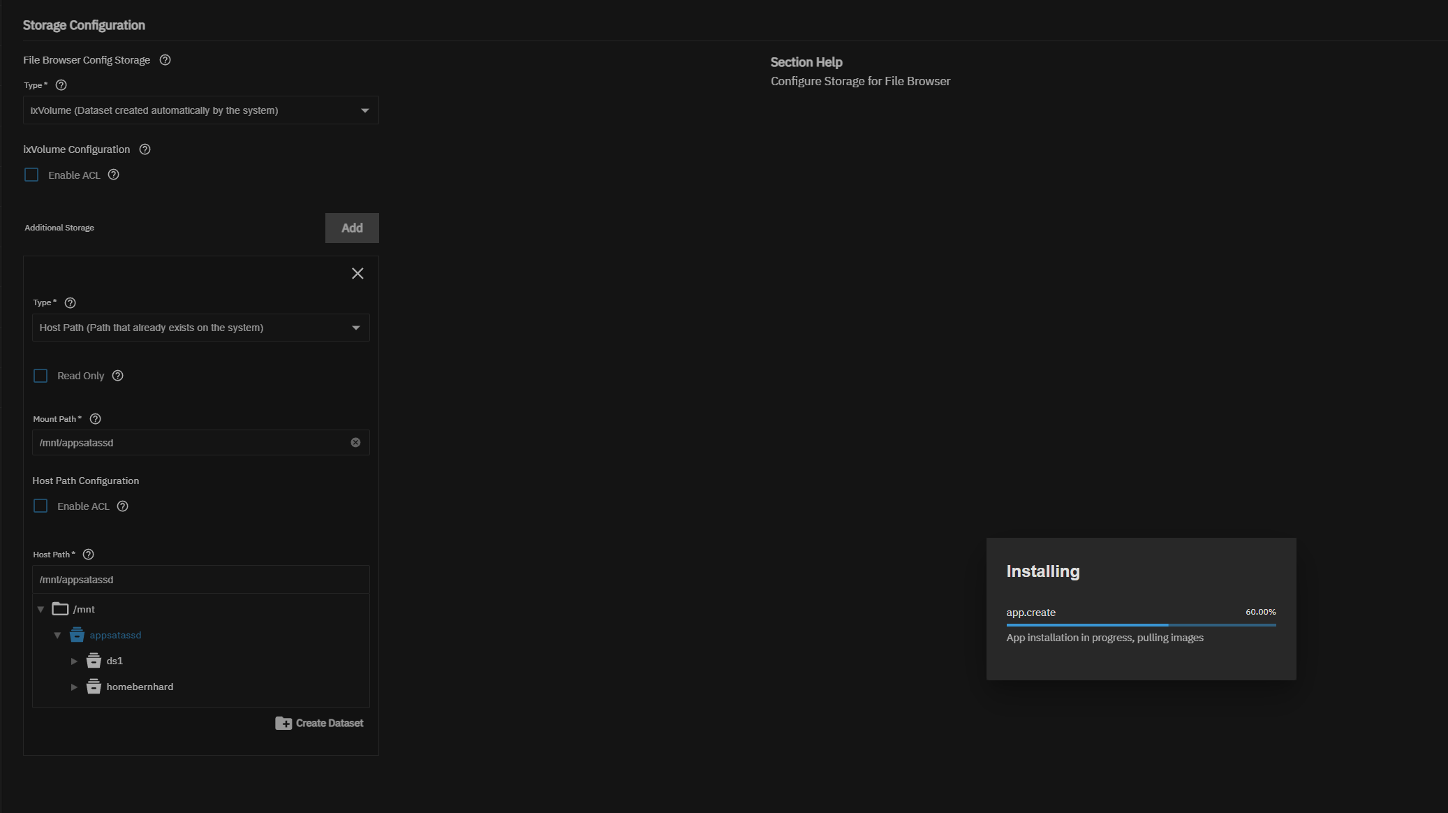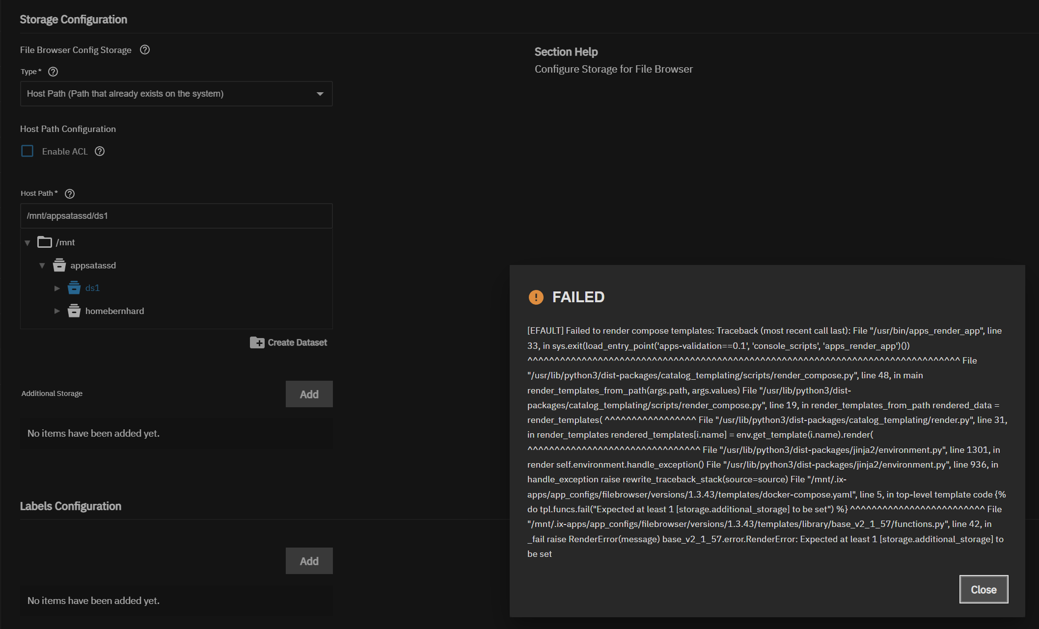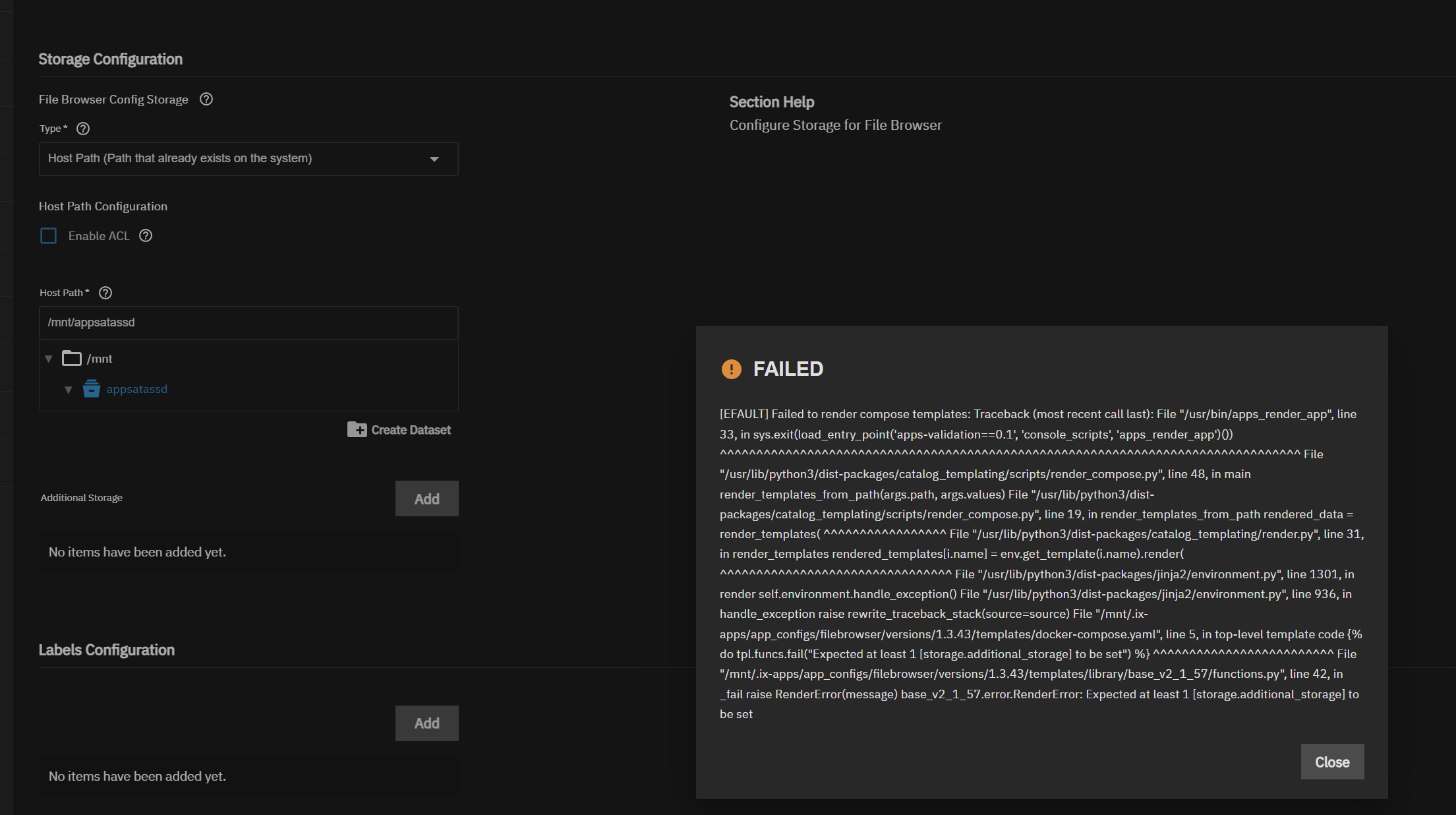 You have nothing set as “Additional Storage” below the “Host Path” definition, but the app expects additional storage (see error message).