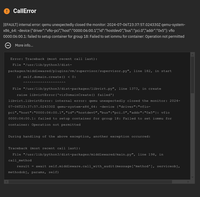 middlewared.service_exception.CallError: [EFAULT] internal error: qemu unexpectedly closed the monitor: 2024-07-06T23:37:57.024330Z qemu-system-x86_64: -device {“driver”:“vfio-pci”,“host”:“0000:06:00.1”,“id”:“hostdev0”,“bus”:“pci.0”,“addr”:“0x5”}: vfio 0000:06:00.1: failed to setup container for group 18: Failed to set iommu for container: Operation not permitted