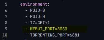 I did some poking around and found out that, in a standard qBittorrent image, you can set ports: - '8080:8080' and it should work, but this causes a conflict with network_mode: container:gluetun according to my logs.