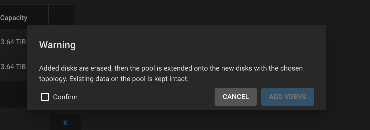 - Select Confirm, then click ADD VDEVS again to complete the process.
