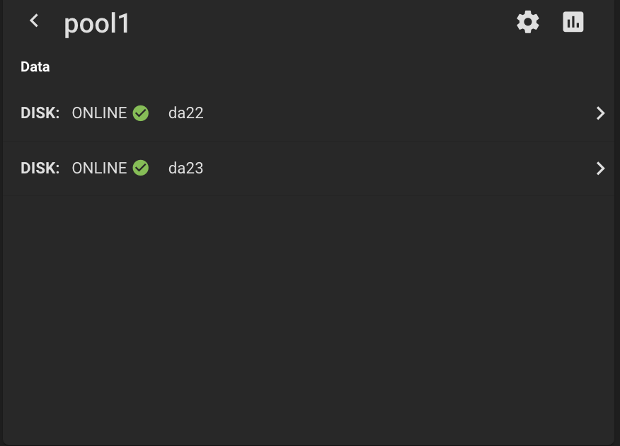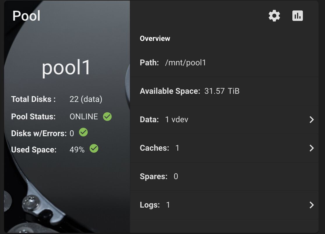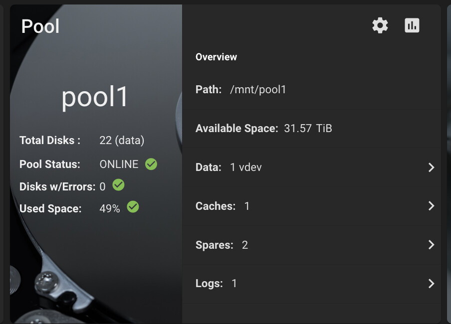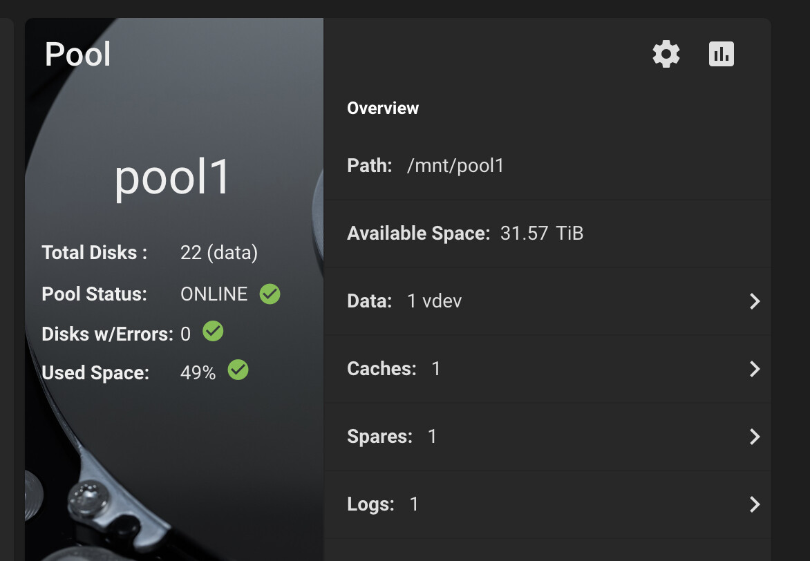 - After completing the job, TrueNAS will return to the Storage > Pools screen. You can check the status by clicking on the settings icon and selecting Status to confirm that the hot spare has been added.