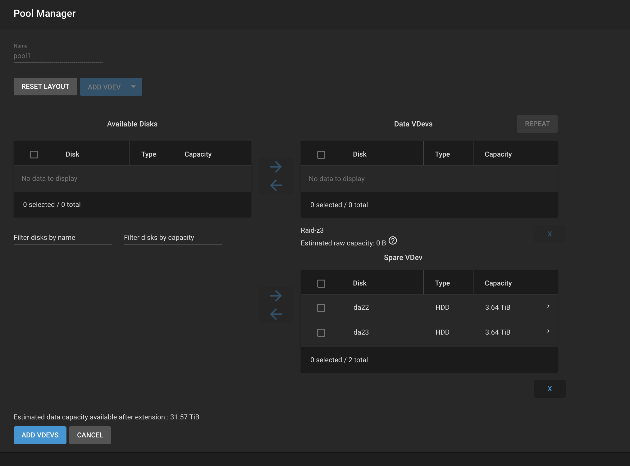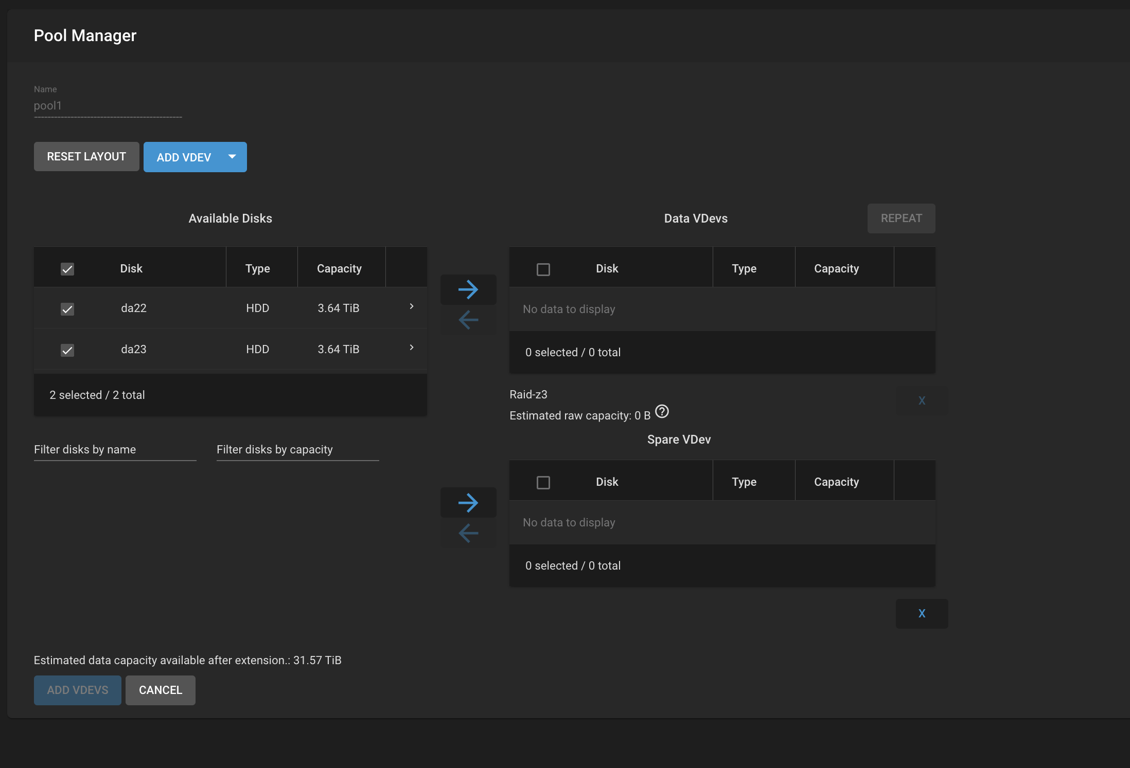 - In the Pool Manager, click ADD VDEV and select Hot Spare.
