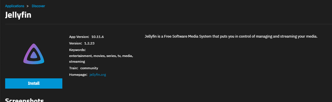 I’m on TrueNAS Scale, 24.04, running Jellyfin as an Application from the catalogue. The Jellyfin from the catalogue (10.10.6) is not the latest version and it seems to take a very long time till it gets a bump.