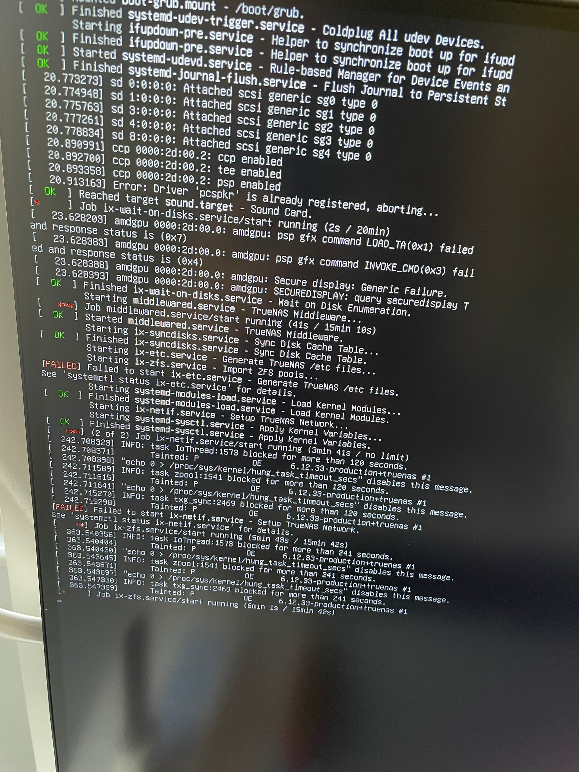 i was trying to move some files from my windowspc to truenas through smb ,however it suddenly stuck .so i just go to the webui page and restart the truenas .however it shows these errors when it boots