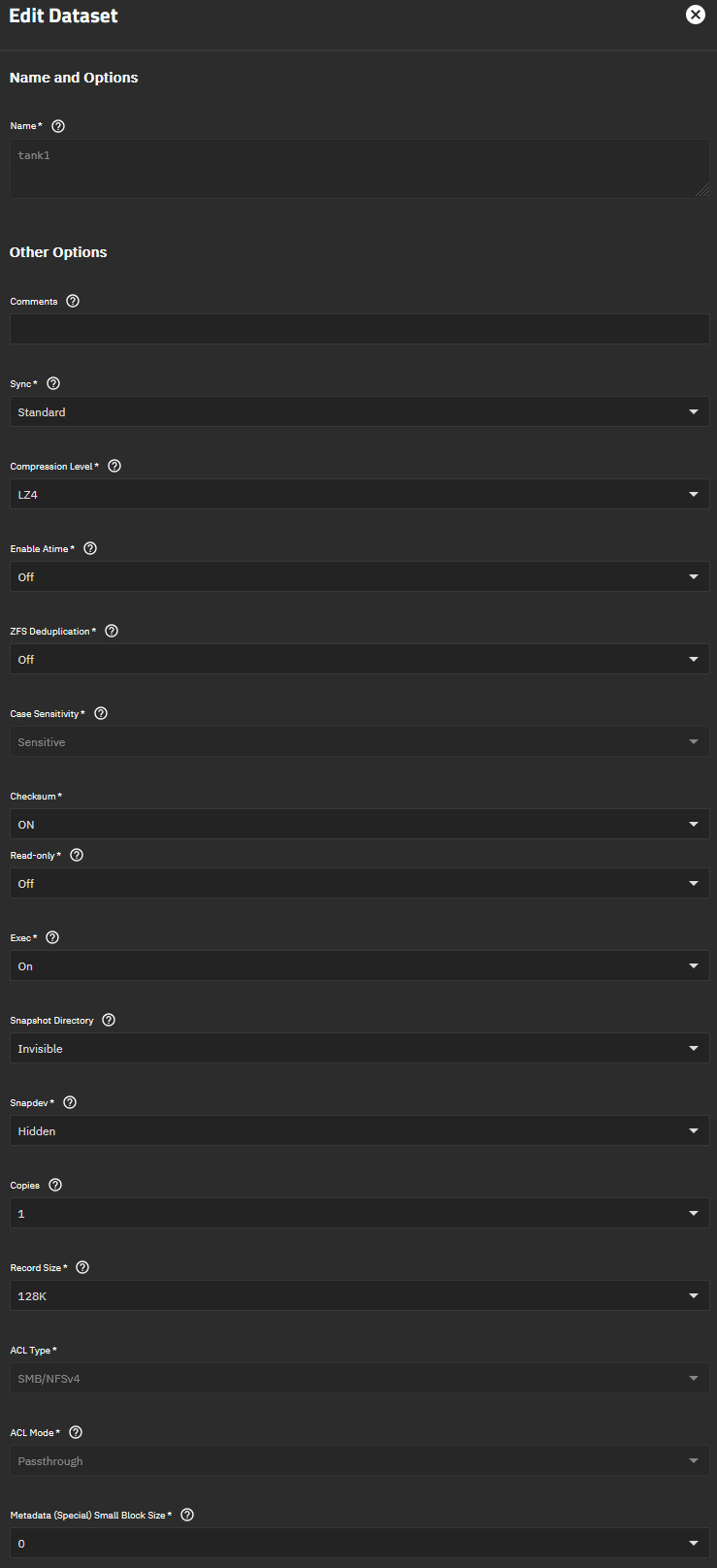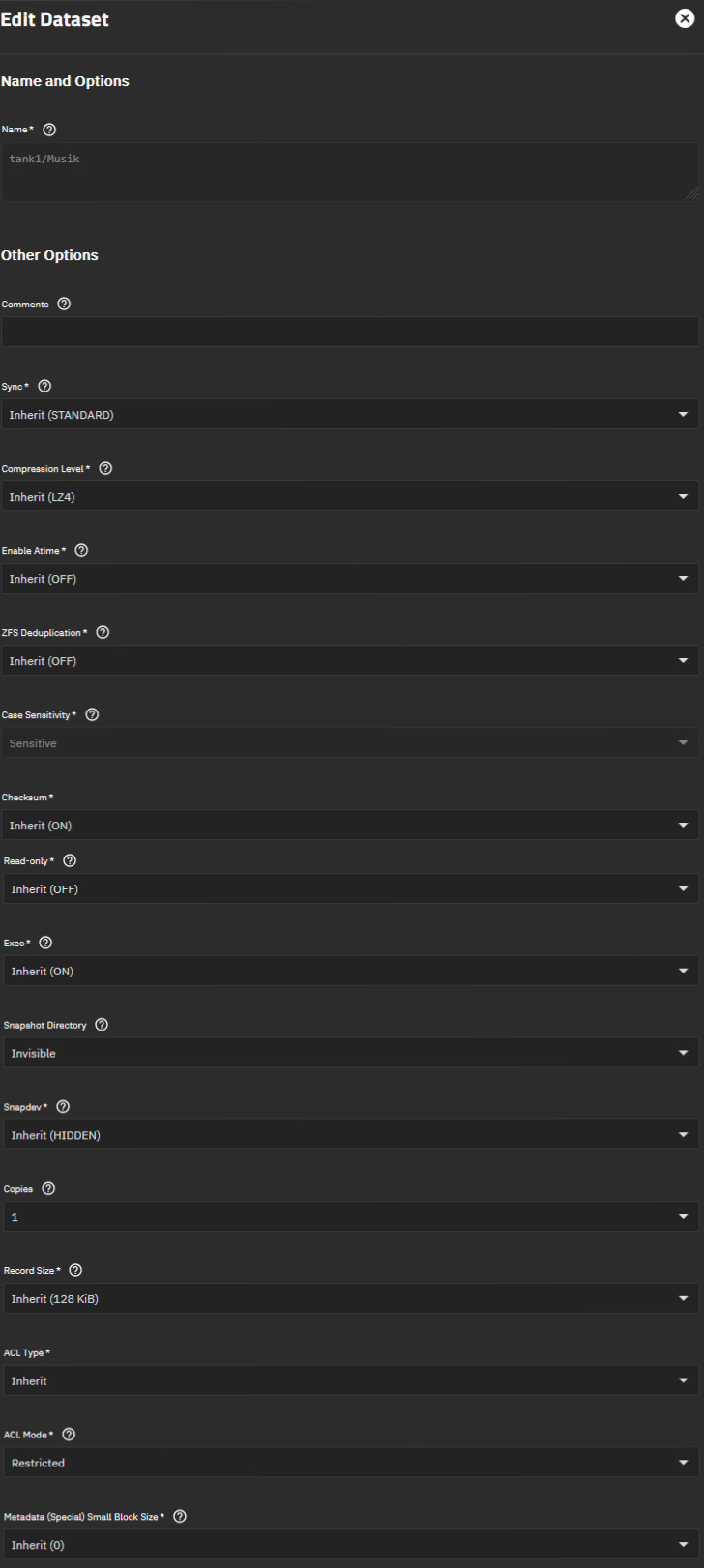 TrueNAS dataset and share settings screenshots: