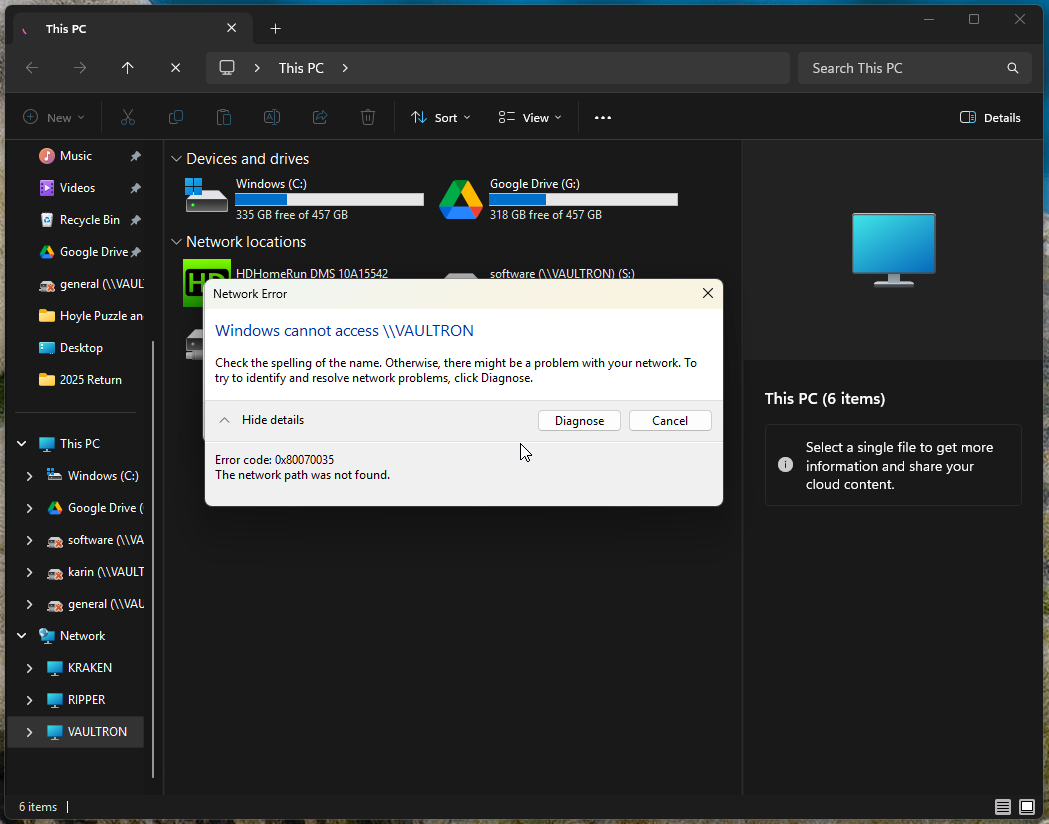 Hmmm…. this is weird. I am very appreciative of the SMB fix, but this isn’t good. Starting last night (over 24 hours after installing the hotfix), I started to see my TrueNAS server “Vaultron” listed in File Explorer and Directory Opus, but when I tried to go to \\vaultron, I got the following (Screen shots from an still affected computer):