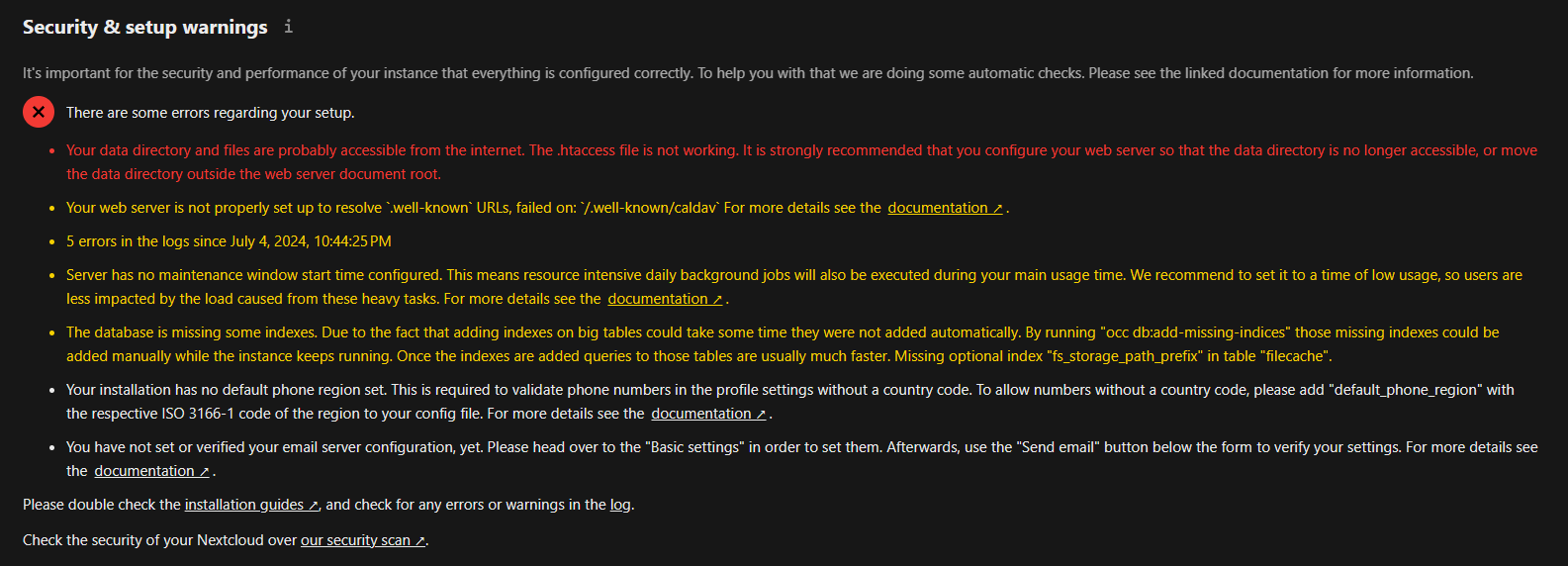 " * Your data directory and files are probably accessible from the internet. The .htaccess file is not working. It is strongly recommended that you configure your web server so that the data directory is no longer accessible, or move the data directory outside the web server document root."