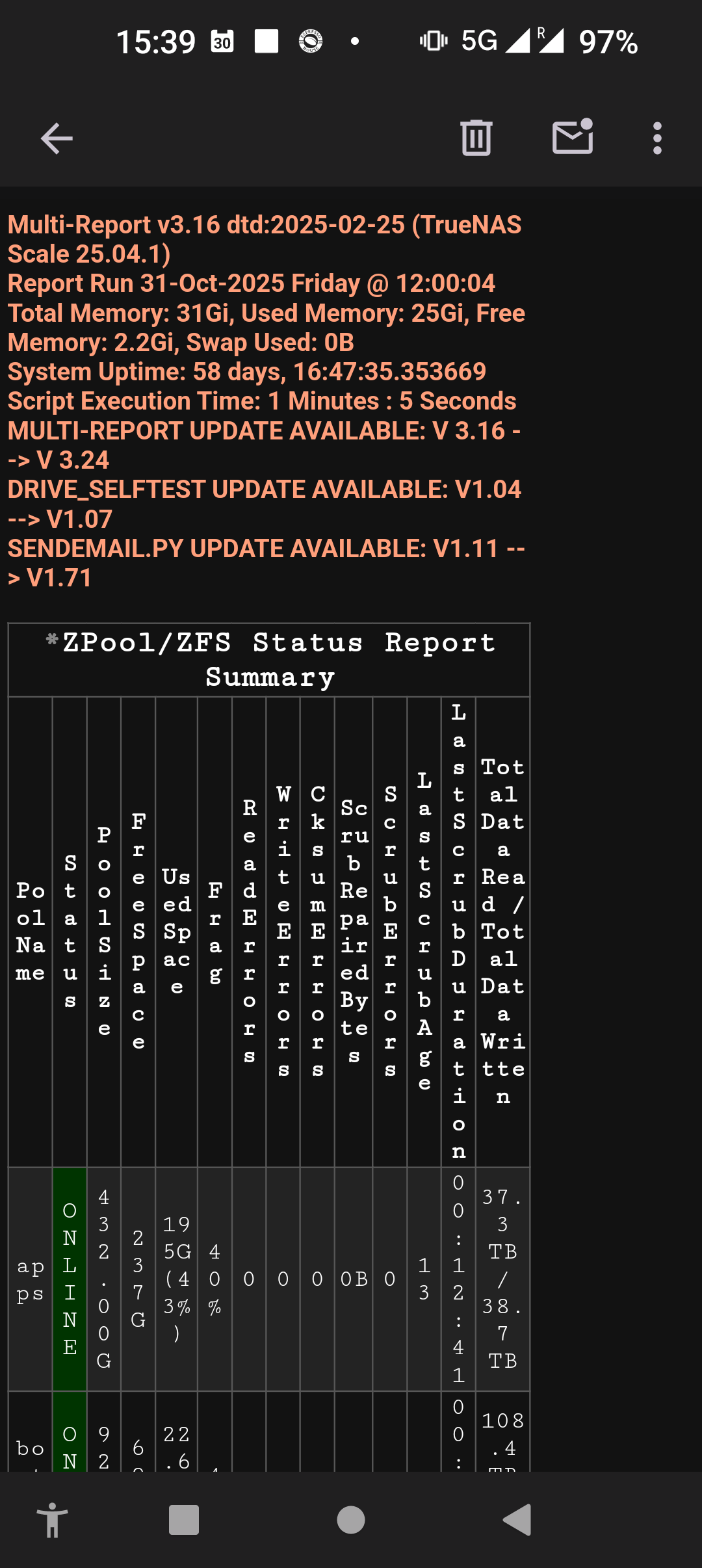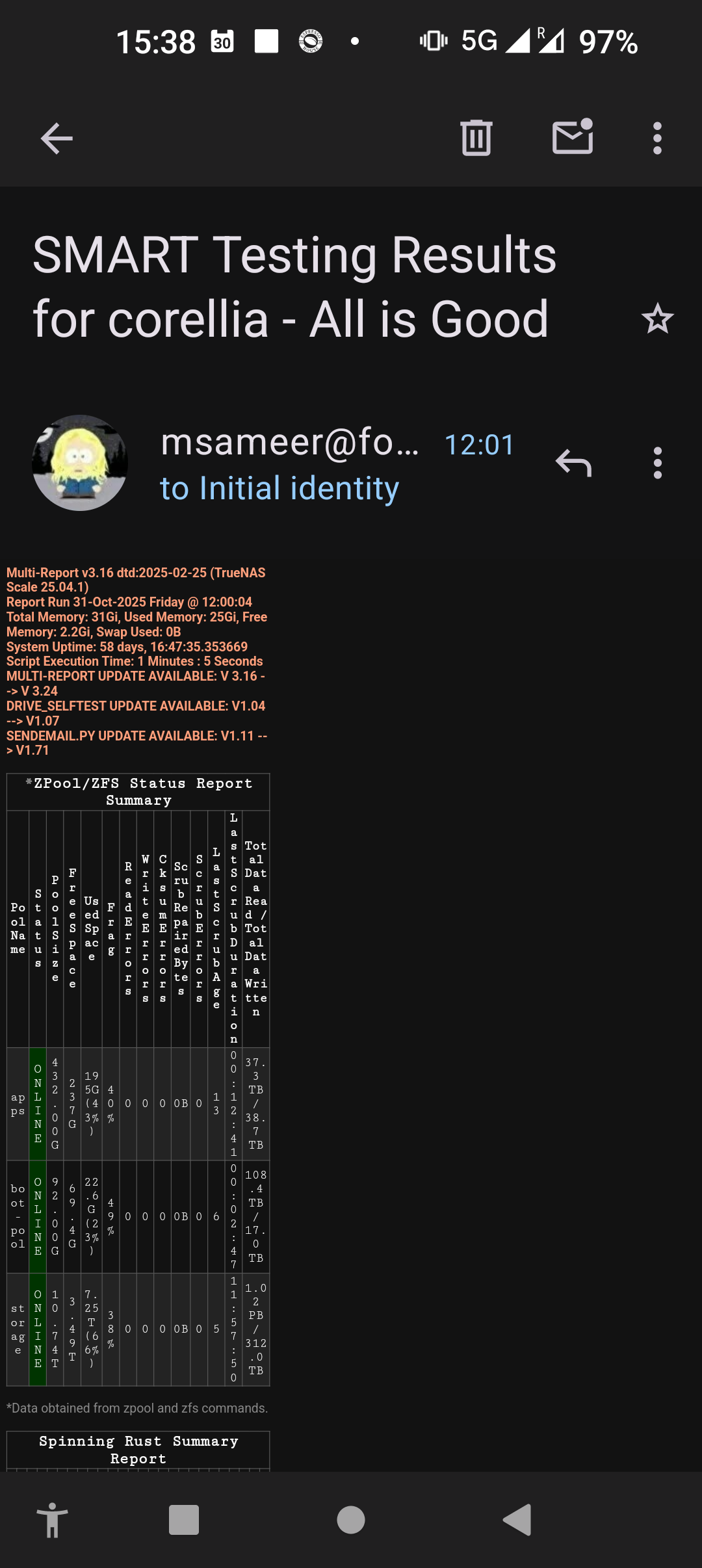 Considering the discussion in today’s T3 podcast, it seems the results of SMART testing is not thought to be reliable enough to be reported as a stand-alone separate item in the GUI. The discussion sort of begs the question of why must a user then have to do manual smart tests on a regular schedule if data protection is an important feature of Truenas?