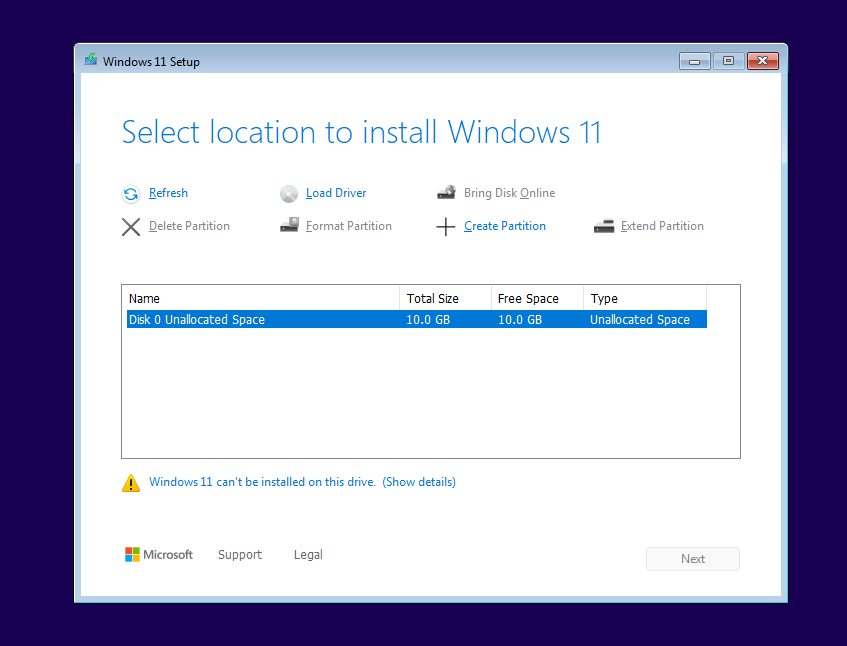 After that, the disk appears and Windows installs normally.