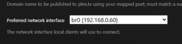 In the network settings for Plex it doesn’t show the 192.168.0.60 IP in the available selections for “Preferred network interface”, just the network for the container are shown. I would think defining the IP to use would allow Plex to see it however it seems this only sets up the mapping of the IP into the container.