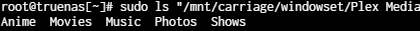 The output is messed up. Can you do a sudo ls "/mnt/carriage/windowset/Plex Media" and check if media is visible there. You don’t have to post the output of the comand. If files are visible using that command then you likely have a permission issue.