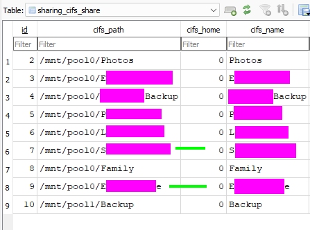 Here is the list of shares. Note the two items of concern: the share beginning with “S” and beginning/ending with “E” (tagged with green). Their mount points are directly in /mnt/pool0 (not subfolders).