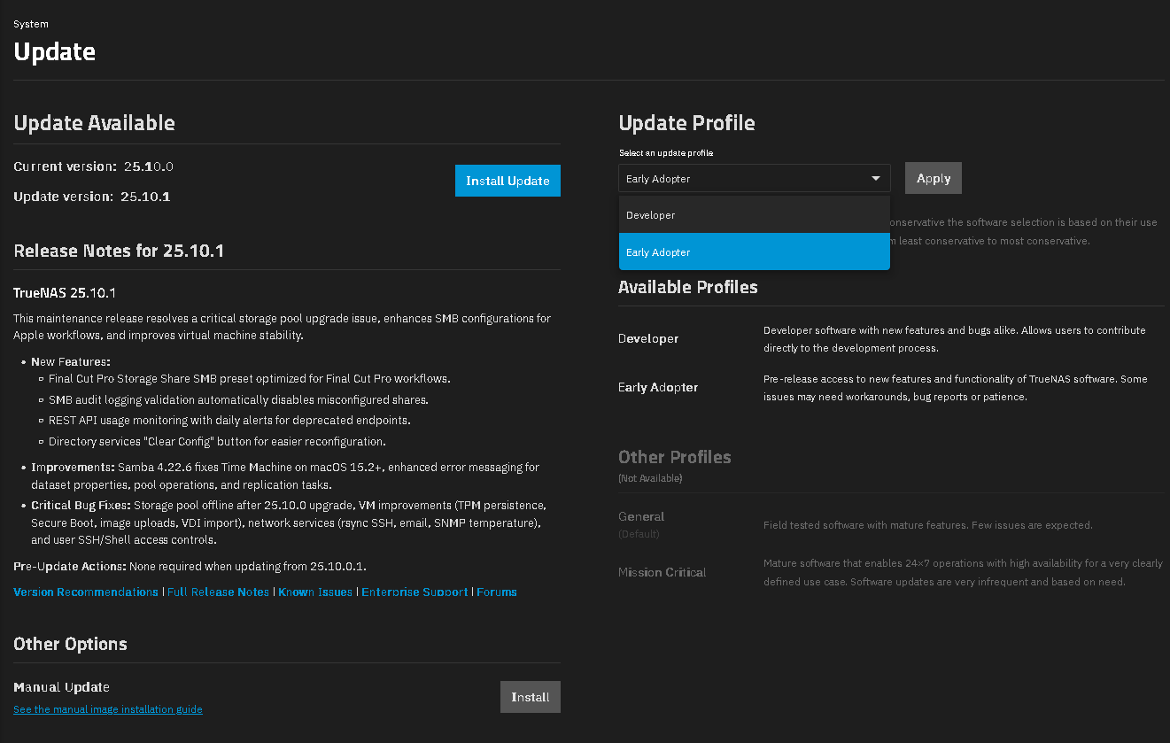 I should add that upgrading to 25.10 puts you in the Early Adopter category at this time. Once they release the next version and move 25.10 to General status on the software status page, then you could choose that. If you upgrade now, you might be stuck in Early Adopter. I don’t know if you can down grade to more conservative status. This is a recent change on the ‘upgrade trains’ shown.