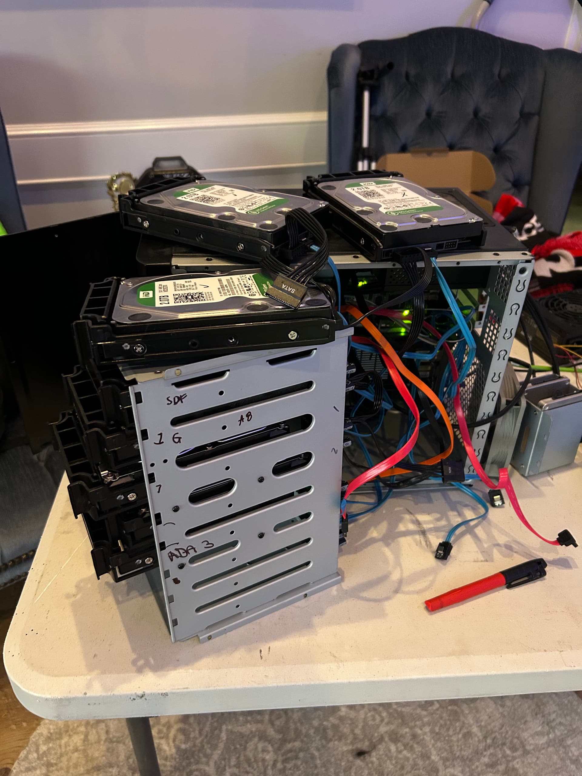 Thanks everyone for trying to help me out, I hooked all the drives up straight to the mother board power and SATA to eliminate the enclosure and am still showing 3 failed drives. At this point I think its time to throw in the towel. There is nothing on there that I cant live without, mainly just media and all of my important stuff was also backed up to the cloud. Now just to decide if I want to purchase more drives or just live my life without a NAS.