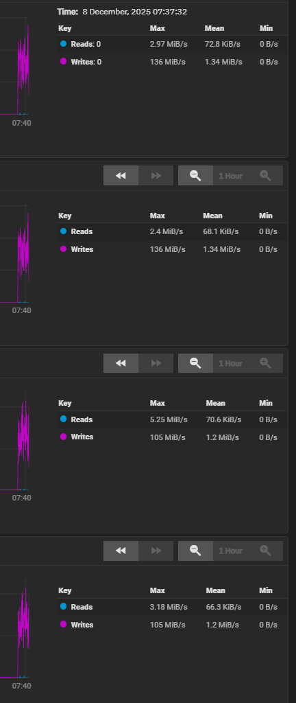 I’ve now removed the four 1TB drives (2 small mirrors) to see if they were causing problems (I was seeing they weren’t being written to all the time (which I guess makes sense, being that they are significantly smaller drives)). Speed is 130-150MB/s now. This is what the 4 remaining drives are doing during this write test:
