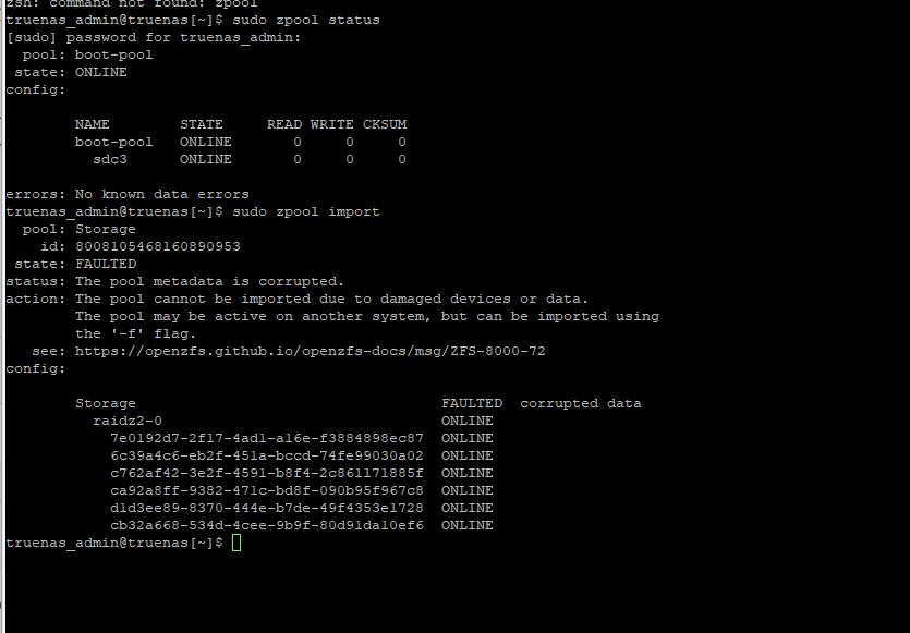 I had a ZFS (raid6 like setup) running. My Truenas machine died, but I installed new hardware and managed to bring the VM back up. The disks are 6 x 2TB WD Red SATA drives