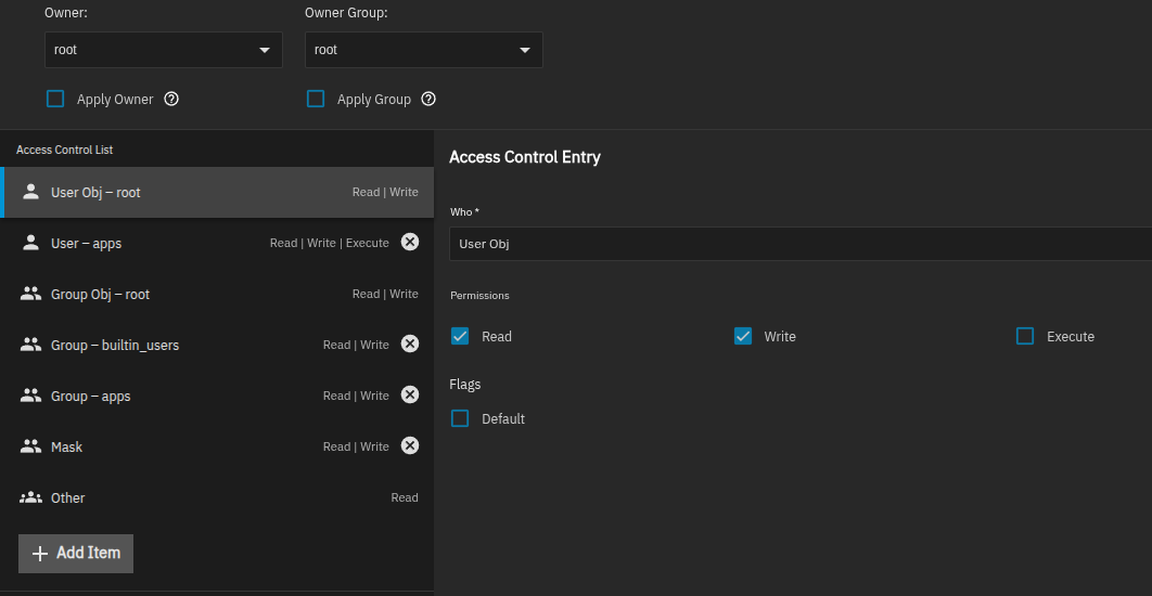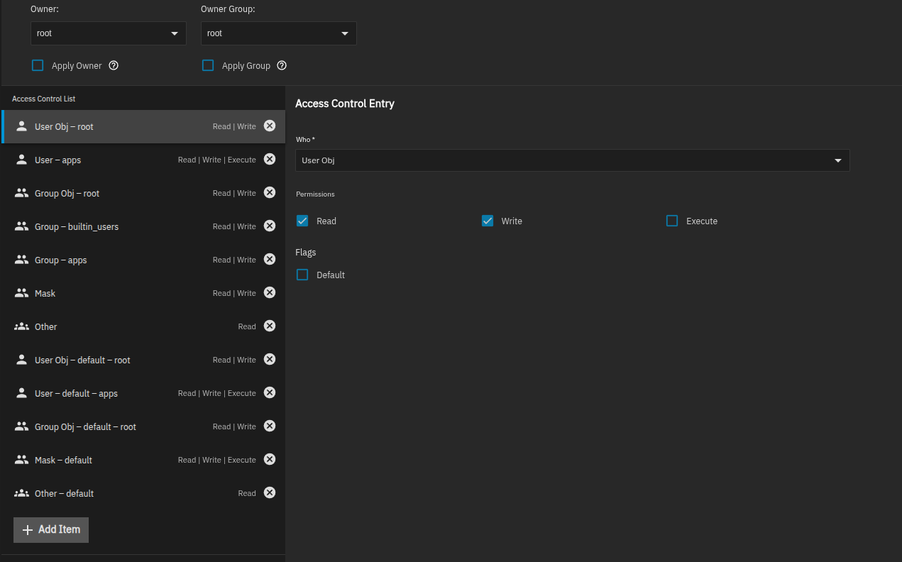 I’ve attached pictures of the current permissions lists I’ve been trying for a test dataset. Owner and Owner Group are left as root. On the second screenshot, I’ve deleted some of the default permissions in case they were causing conflicts. Both setups just lead to Error 403 when I try to upload a file to the dataset using Filebrowser.