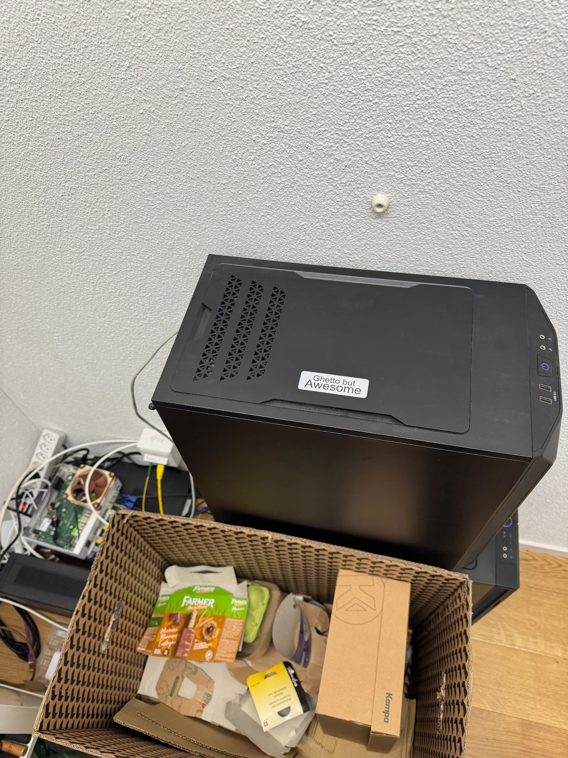 The two towers holding up the shelf each house an Adaptec 82885T connected to eight 4TB SAS drives in RAID-Z3.