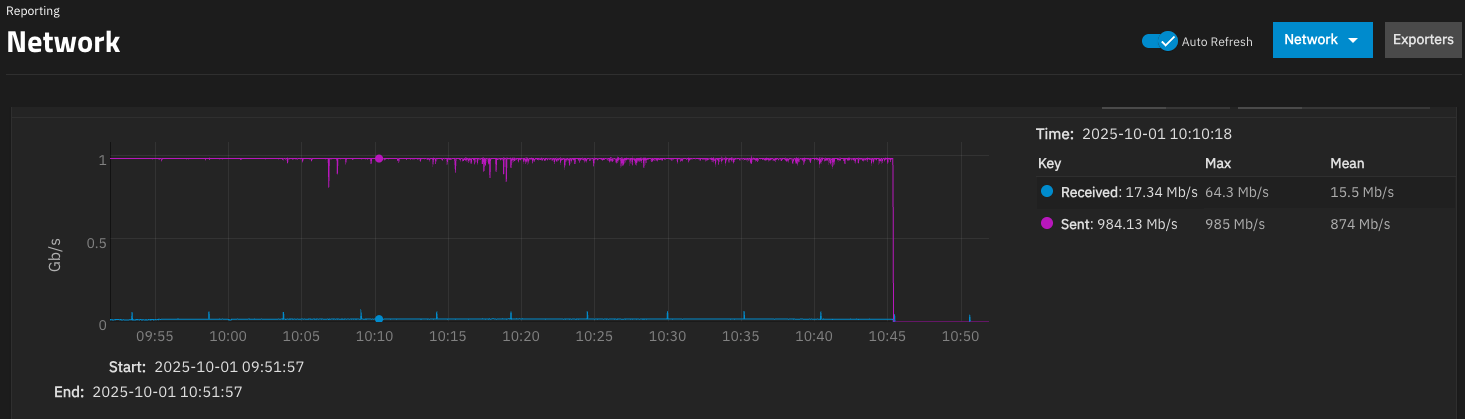 This dd same command ran from the storage itself sees over 5.5 GB/s. The load average on the truenas hovers around 10 – which seems pretty high for only stream 1 Gb (gigabit) of data.
