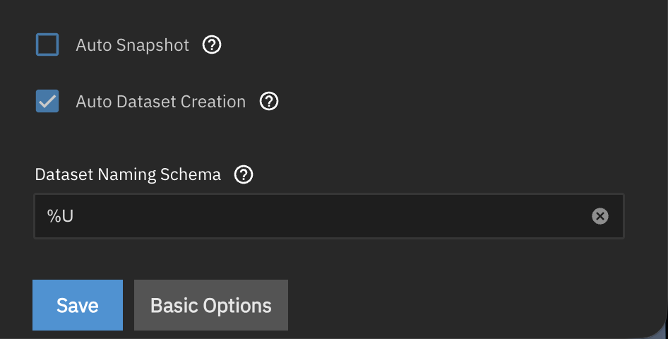 If I expand out the Advanced Options I see a checkbox for “Auto Dataset Creation” which I think might be the option I need but when I turn that I the Save button greys out.