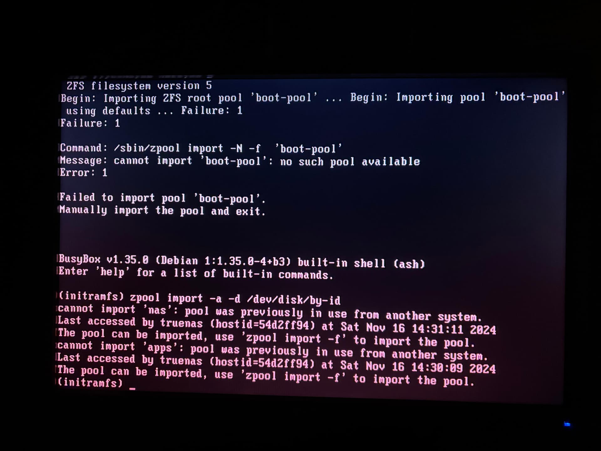 Y’all are awesome! I ran into this same issue after accidentally nuking my boot pool. Fresh install wouldn’t work, even tried plugging the SSD into my PC and wiping all the partitions, but it still had the same hang up at boot. But then following this guide fixed it. Thank you so much!