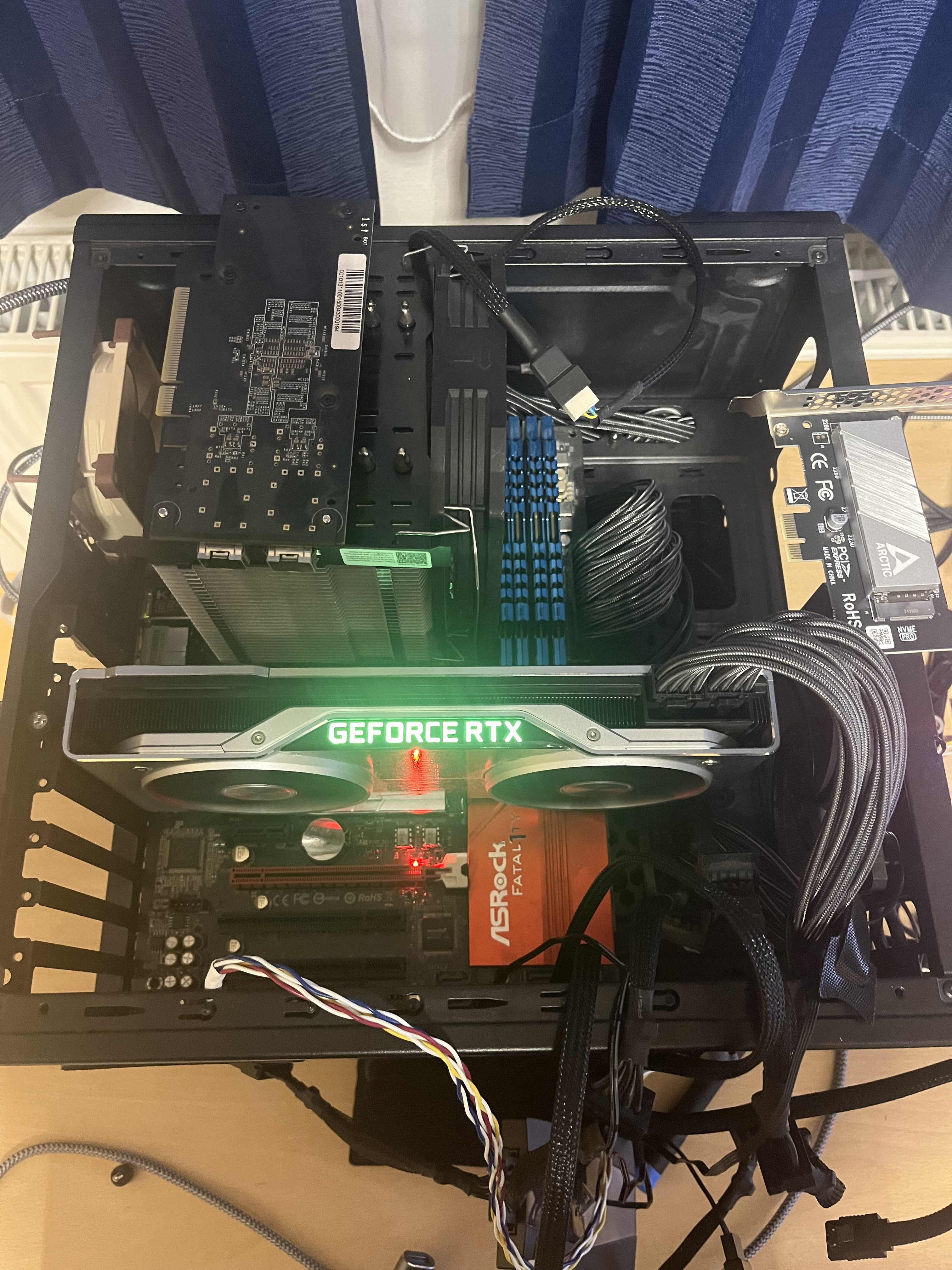 DAs ist zurzeit das System als liegt alles herum und ja ich weis die 2 8tb Platten sind nur mit x1 angebunden … maximal für 2 jahre dan kommt mein altes x299 brett dan habe ich das problem weck.