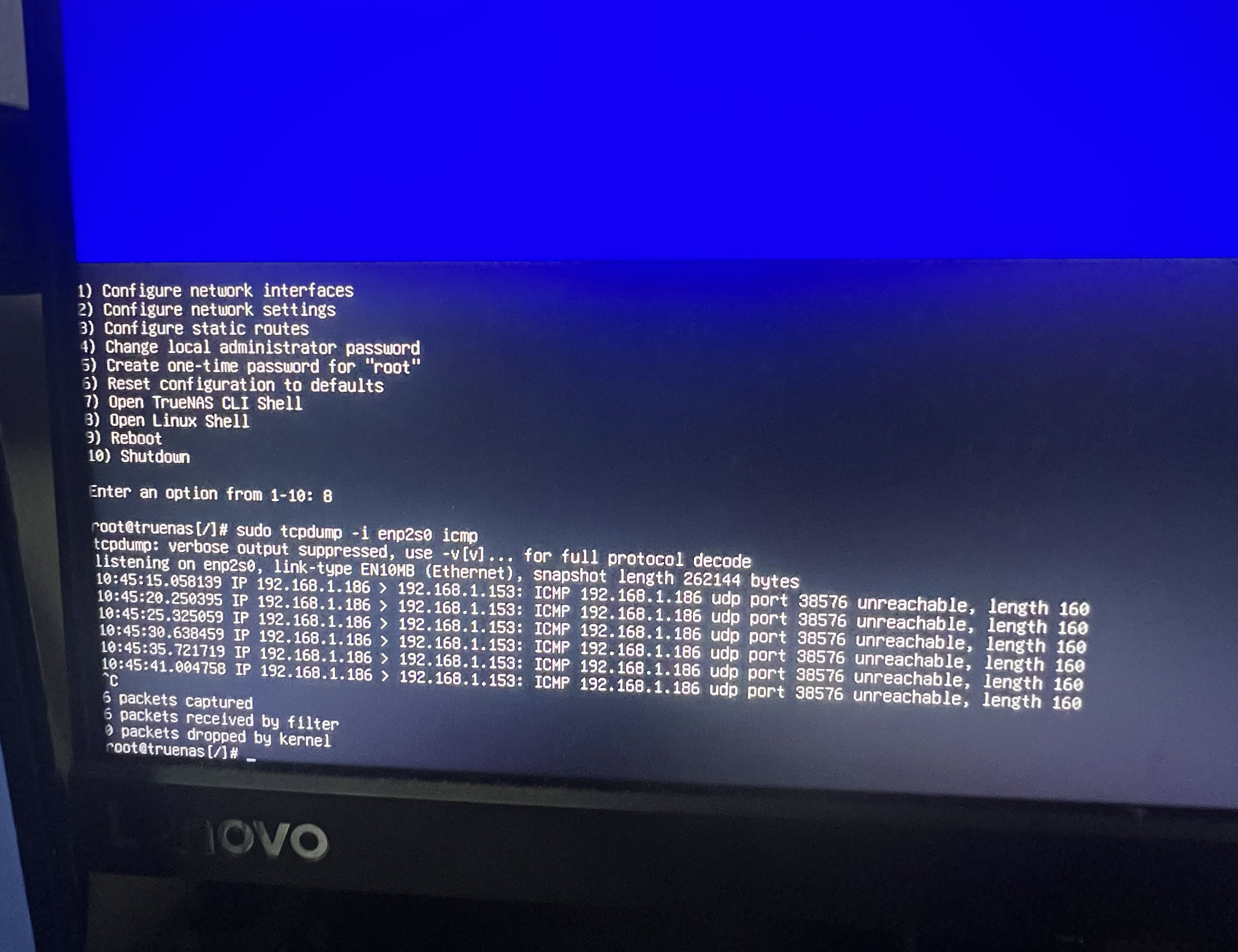 When it reset the first time, it said “no network interface” so I had to go into the network settings and make it get an IP through DHCP. Once it did, it was the same IP address it’s always gotten: 192.168.1.186. Still wasn’t reachable by ping or GUI