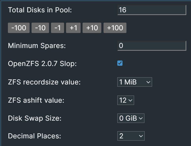 If you set the recordsize dropdown back to 128K, it should fix the issue. I need to add a note to the calculation – ZFS always uses 128K records when calculating capacity in zfs list. By changing the recordsize dropdown on the calculator, you can estimate how much you can actually store despite what zfs list shows you.