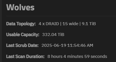 I know ZFS has some overhead and slop, but slop is now limited to 128GiB (negligible in this pool), meaning the overhead is in tens of terabytes. Something about that seems very wrong: almost 600 GiB per drive in this pool. That’s over 6% of the drive!