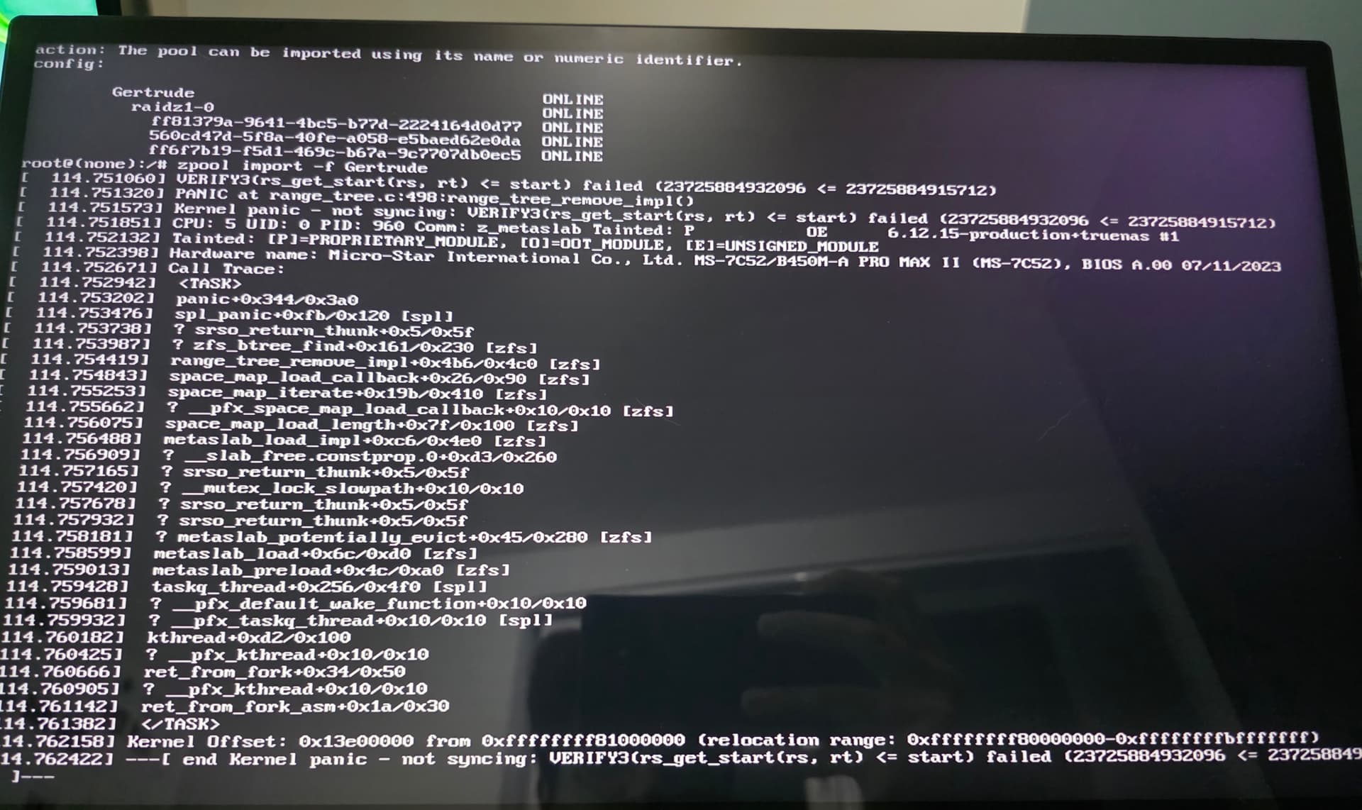 Kernal panic - not syncing: VERIFY3(rs_get_start(rs, rt) <= start) failed (23725884932096 <= 23725884915712)