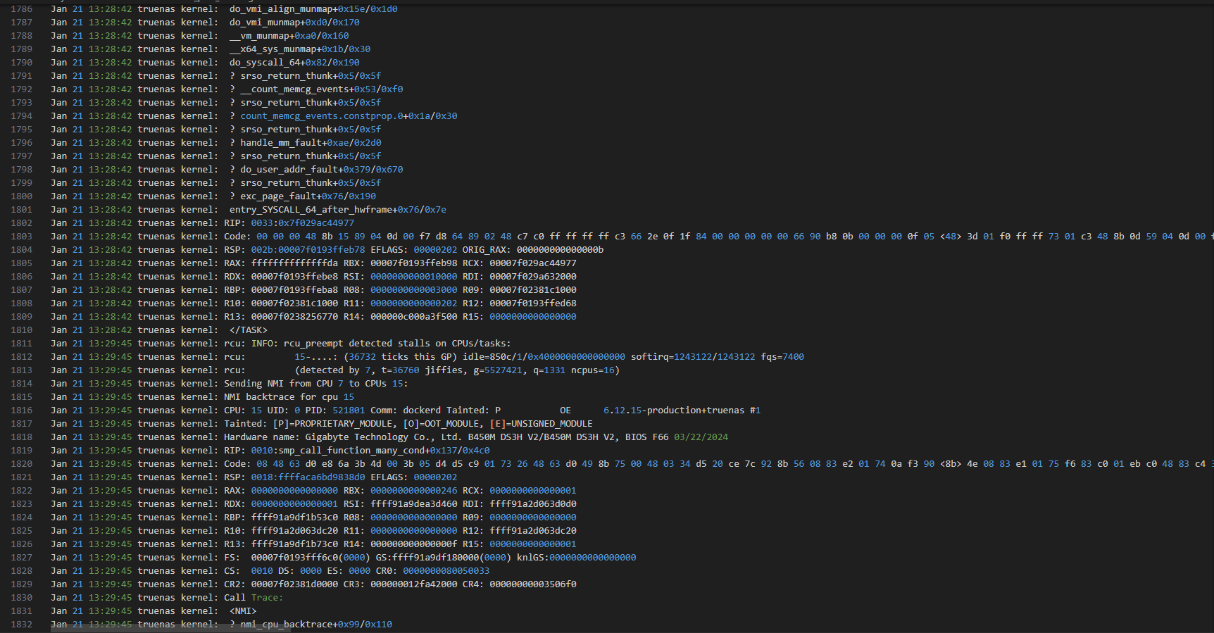 Hi. I’ve encountered the following problem: after about a day of running the server, it freezes. I can’t access it either via the web or SSH. I saw messages on the monitor, but I don’t really understand them. I’m attaching a log of what I saw. It all started at Jan 21, 11:52:59 AM. After rebooting, the server works for a day, and then it starts all over again. For now, I can only offer a photo, as I can’t upload a txt file.