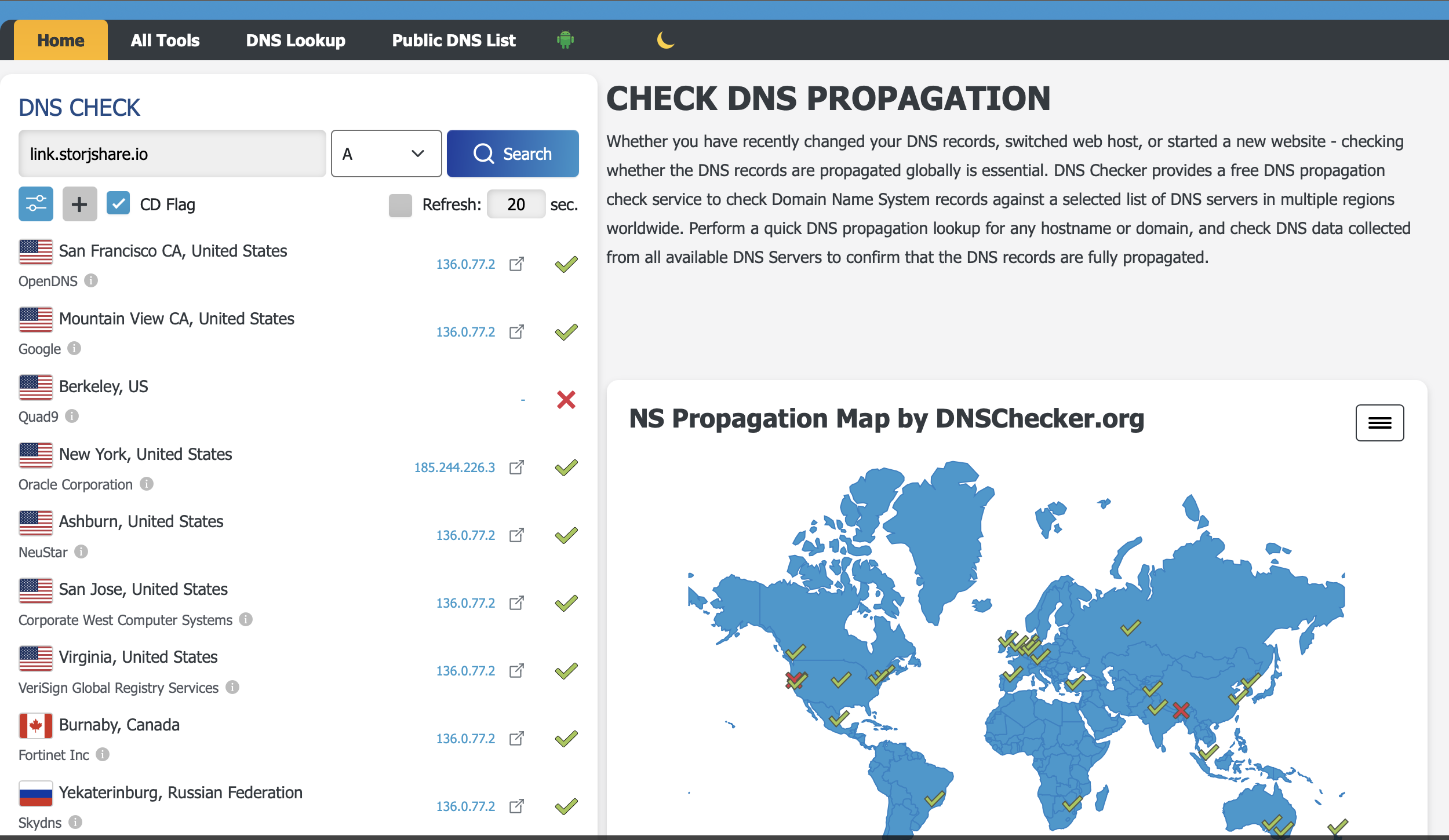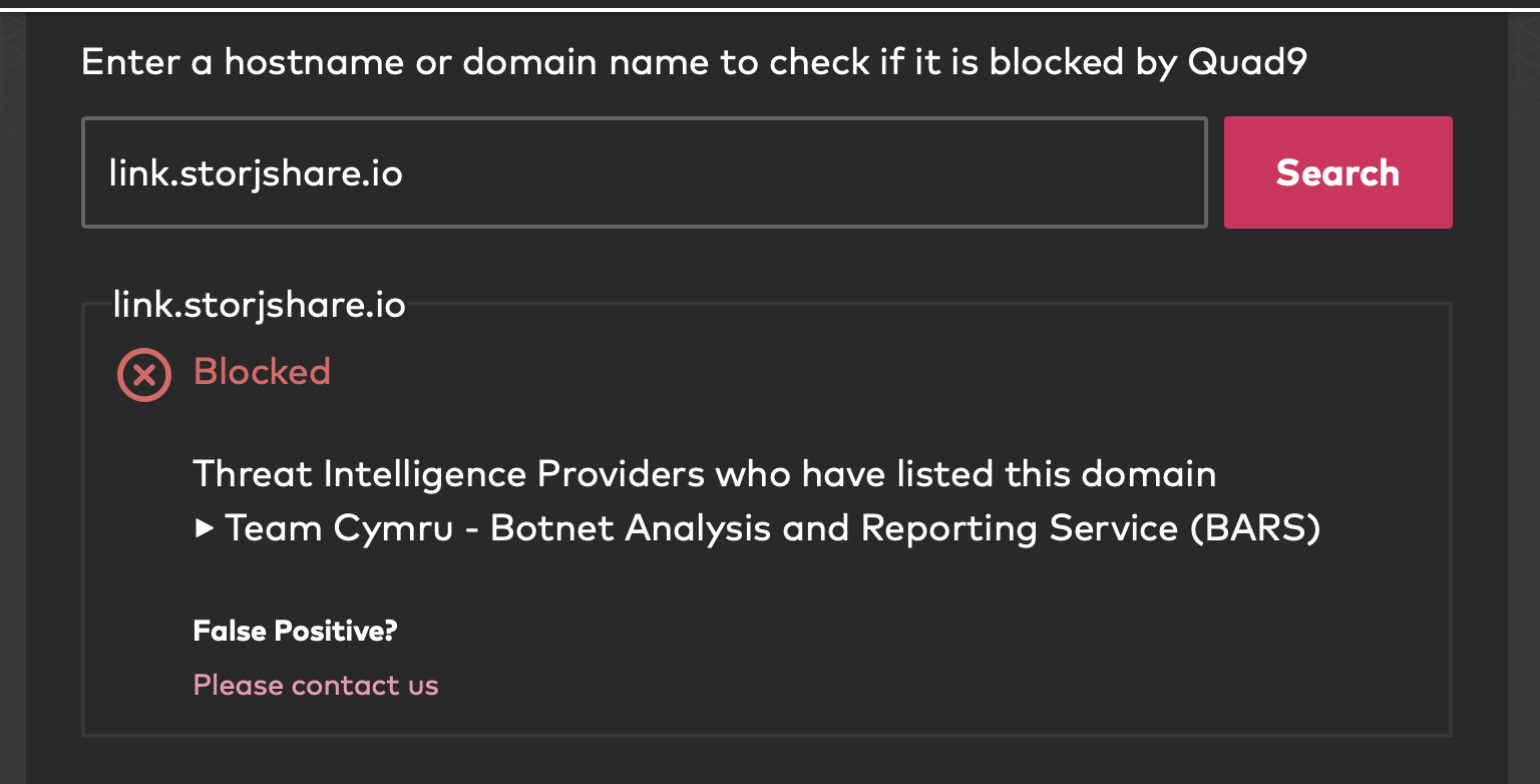 Looks like link.storjshare.io is at least resolving now, but it is still blocked by Quad9. I have not received a response yet from Quad9. I temporarily added Google DNS in the meantime.