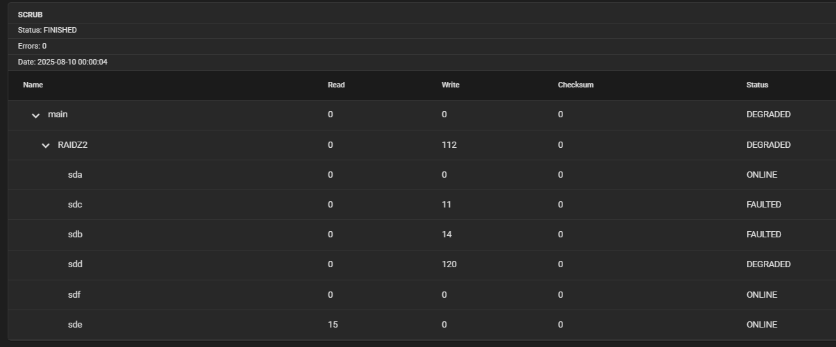 My storage pool has become degraded, and I’ve searched through other degradation discussions on the forum, but I’m not sure if they apply to my specific situation. I’m hoping someone can help me resolve this issue.