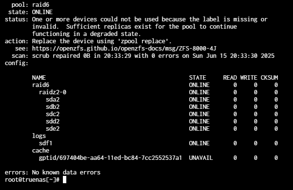 • Pool raid6 state is ONLINE: One or more devices could not be used because the label is missing or invalid. Sufficient replicas exist for the pool to continue functioning in a degraded state.