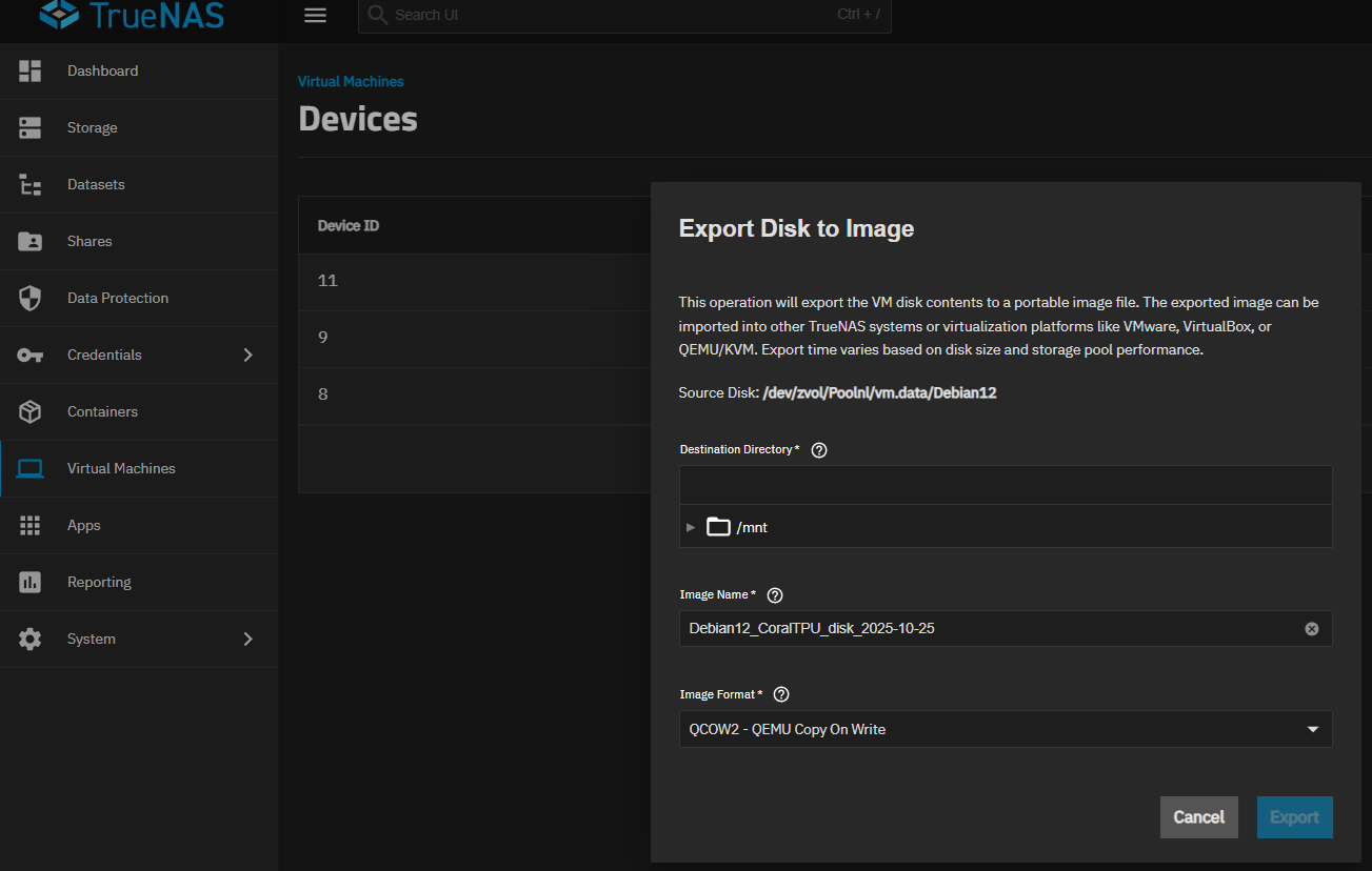 It should also have sidecars or zip with config files where device and config data so that if a restore needs to be done from an external disk can be recopied to location on the nas and spun up quickly. If the purpose is to rely on VM for security. Backup of the VM is nessessary for ofline off truenas. I want external drive backup so if all drives /pool dies (all snapshots/duplicates/etc die) I can restore to new machine quickly. In What is the most appropriate way to do backup of a VM in a TrueNAS scale system? - #11 by eldxmgw Stucs said you cant. I just dont understand why a program so fucused on ZFS resilance cant hold a copy to a SMB share so I can access and export. I know SOLVED: Zvol "Options cannot be loaded" in VM>Disk>Edit Device zvol replication is just a ZFS trick and maynot be accurate. But many ways Virtualbox, VMware, Proxmox, etc have simple way of backing up not only the VM data but the config and hardware steps as well. Seems Truenas should as well since the structure is already there. I welcome other ways of doing this. Thanks