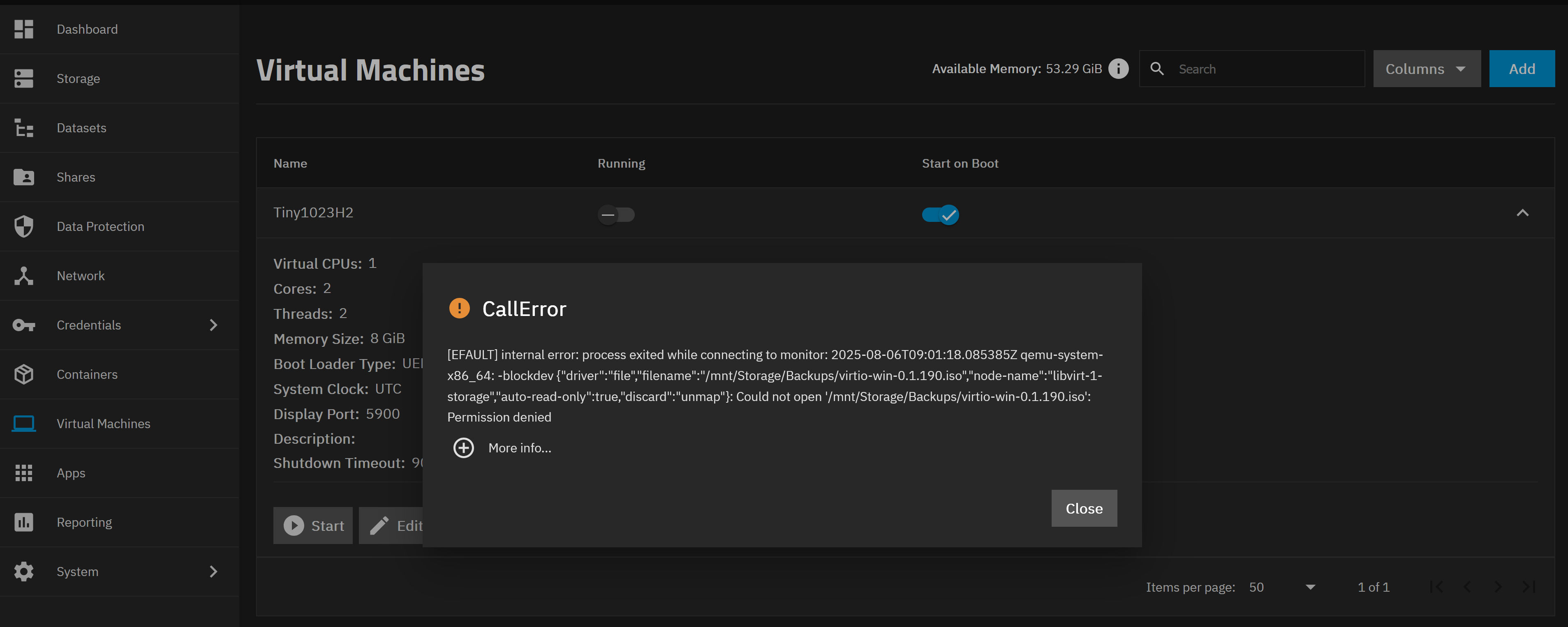 middlewared.service_exception.CallError: [EFAULT] internal error: process exited while connecting to monitor: 2025-08-06T08:24:18.120914Z qemu-system-x86_64: -blockdev {“driver”:“file”,“filename”:“/mnt/Storage/Backups/virtio-win-0.1.190.iso”,“node-name”:“libvirt-1-storage”,“auto-read-only”:true,“discard”:“unmap”}: Could not open ‘/mnt/Storage/Backups/virtio-win-0.1.190.iso’: Permission denied