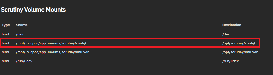 I.e. we can place a file in /mnt/.ix-apps/app_mounts/scrutiny/config/scrutiny.yaml and it will appear in the container as /opt/scrutiny/config/scrutiny.yaml.