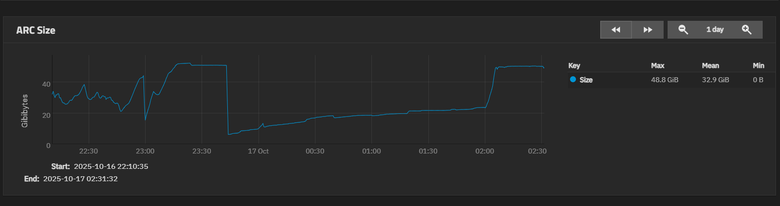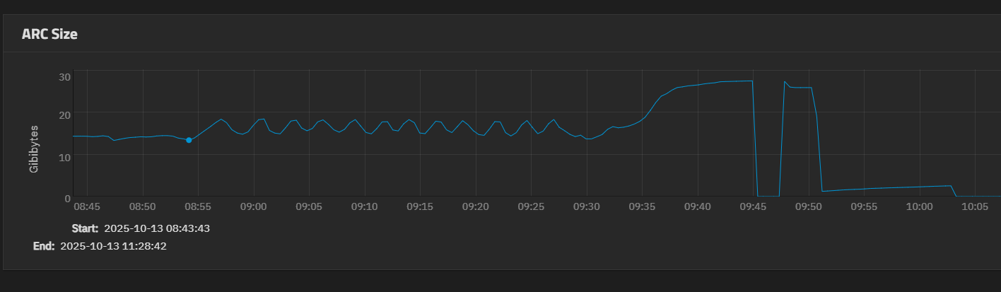 Right when the ARC size starts to climb, I completely lose SMB and the networking speed of my qBittorrent VPN container drops to a crawl. The system is still usable and can still reach the internet, but both SMB and qBittorrent are mostly dead until the sharp drop off a few minutes later.