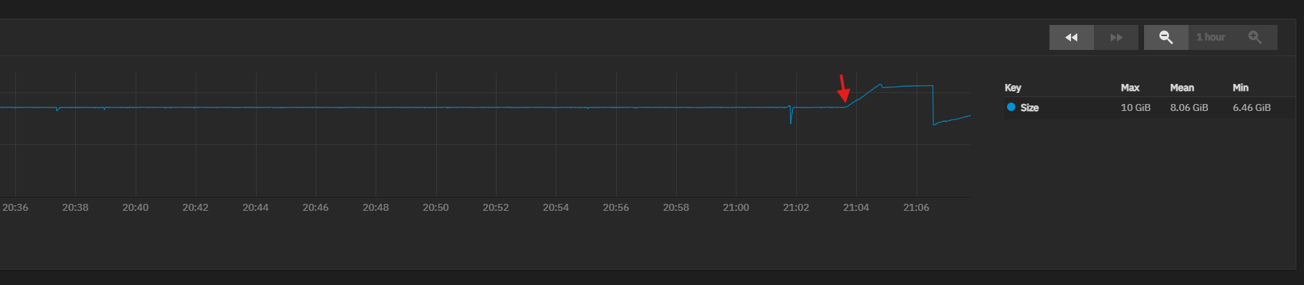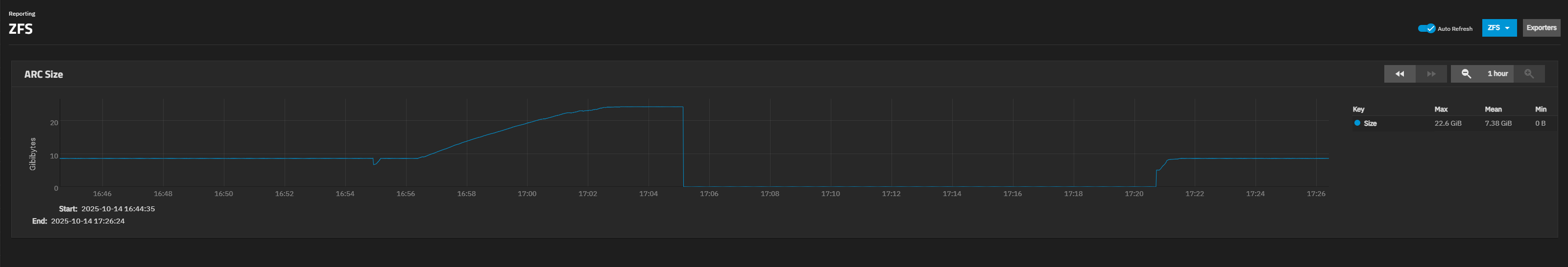 Here is a screenshot from the ZFS Arc size graph from when this occurred today. Each of the four instances that this has happened all follow a similar pattern.